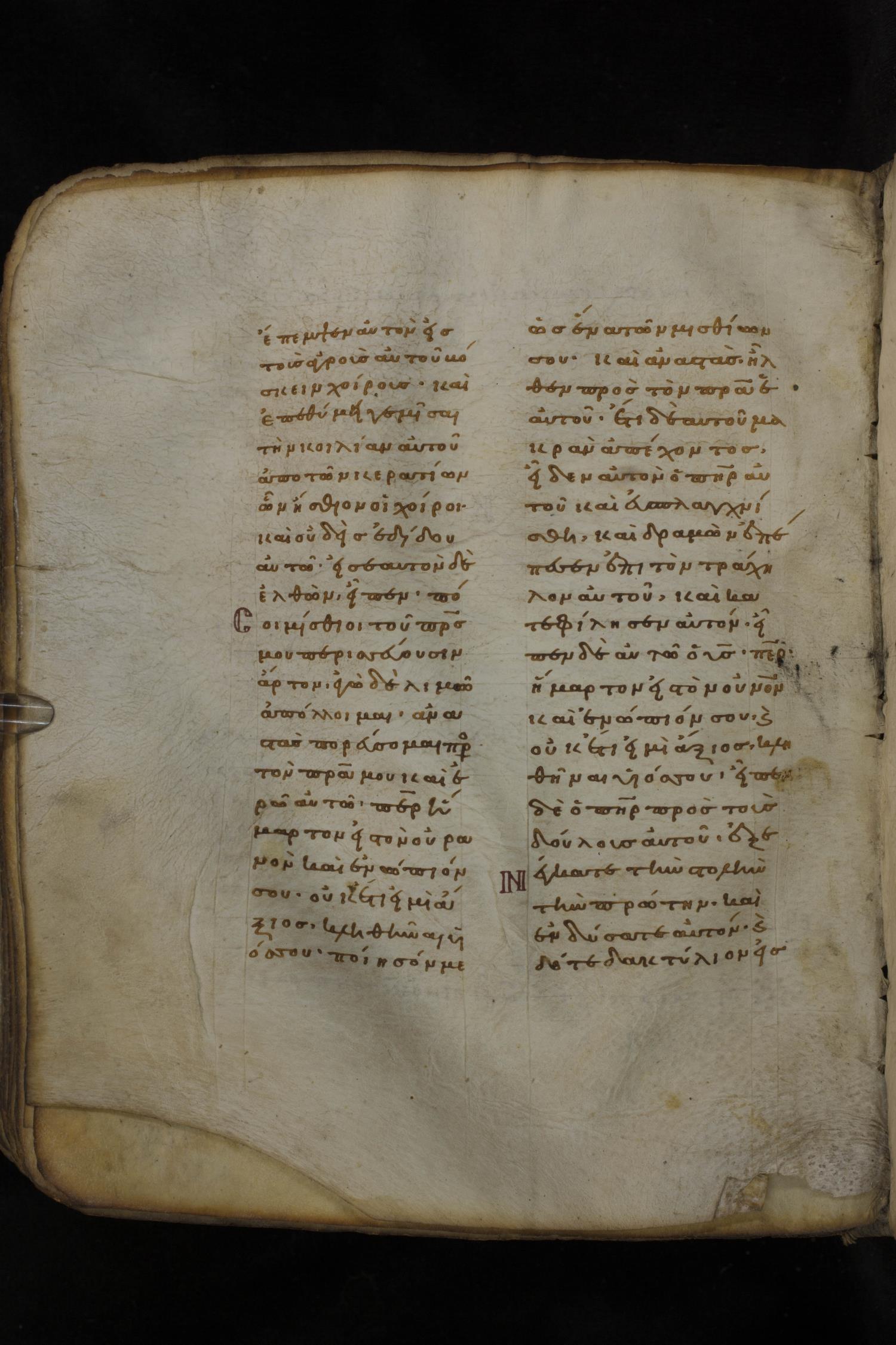 Eleventh century minuscule of the Gospels on parchment; 266 leaves, 2 column, 22 lines per column. Images were taken at the National Library of Greece in Athens.