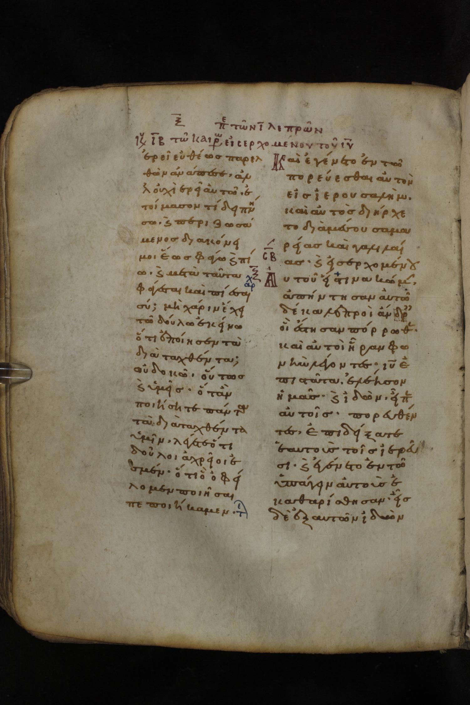 Eleventh century minuscule of the Gospels on parchment; 266 leaves, 2 column, 22 lines per column. Images were taken at the National Library of Greece in Athens.