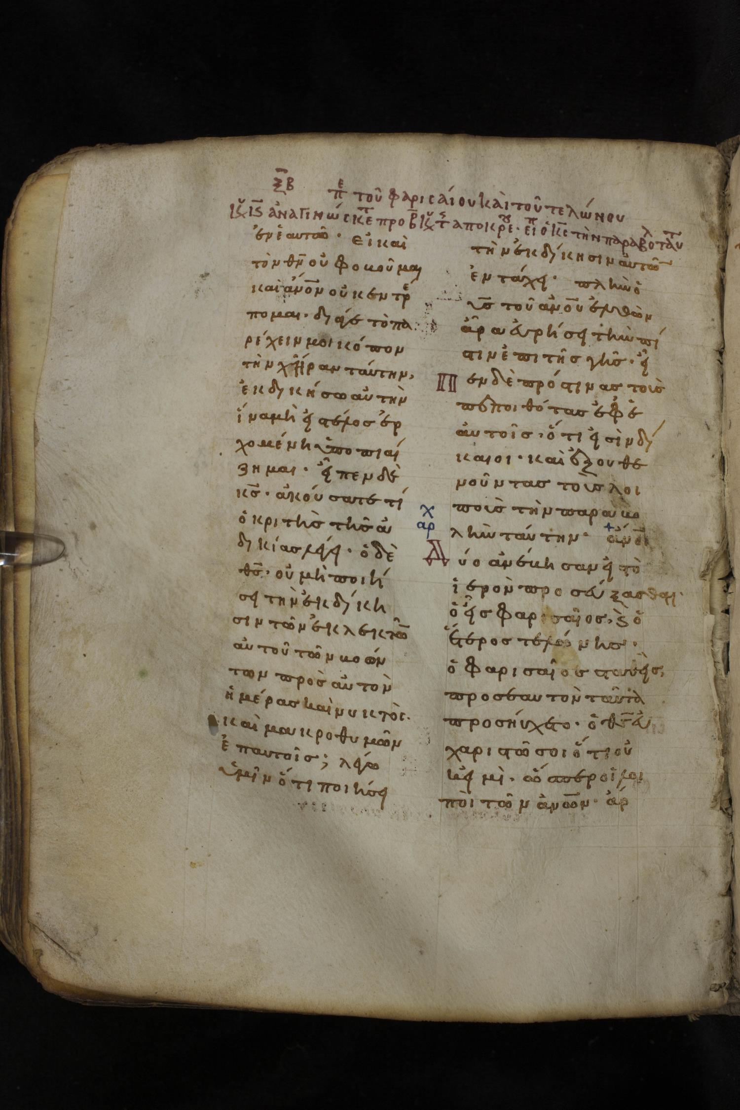 Eleventh century minuscule of the Gospels on parchment; 266 leaves, 2 column, 22 lines per column. Images were taken at the National Library of Greece in Athens.