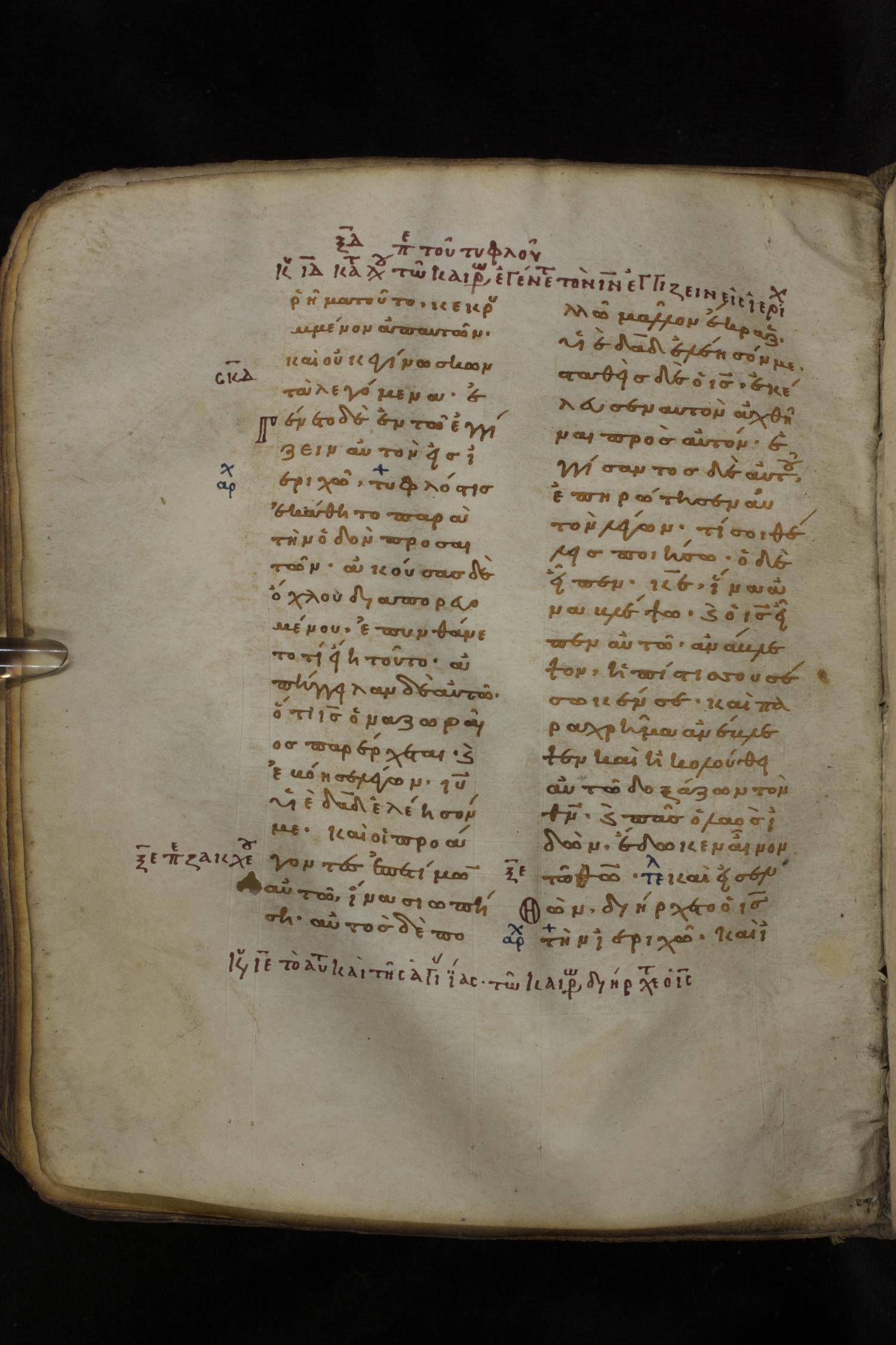 Eleventh century minuscule of the Gospels on parchment; 266 leaves, 2 column, 22 lines per column. Images were taken at the National Library of Greece in Athens.