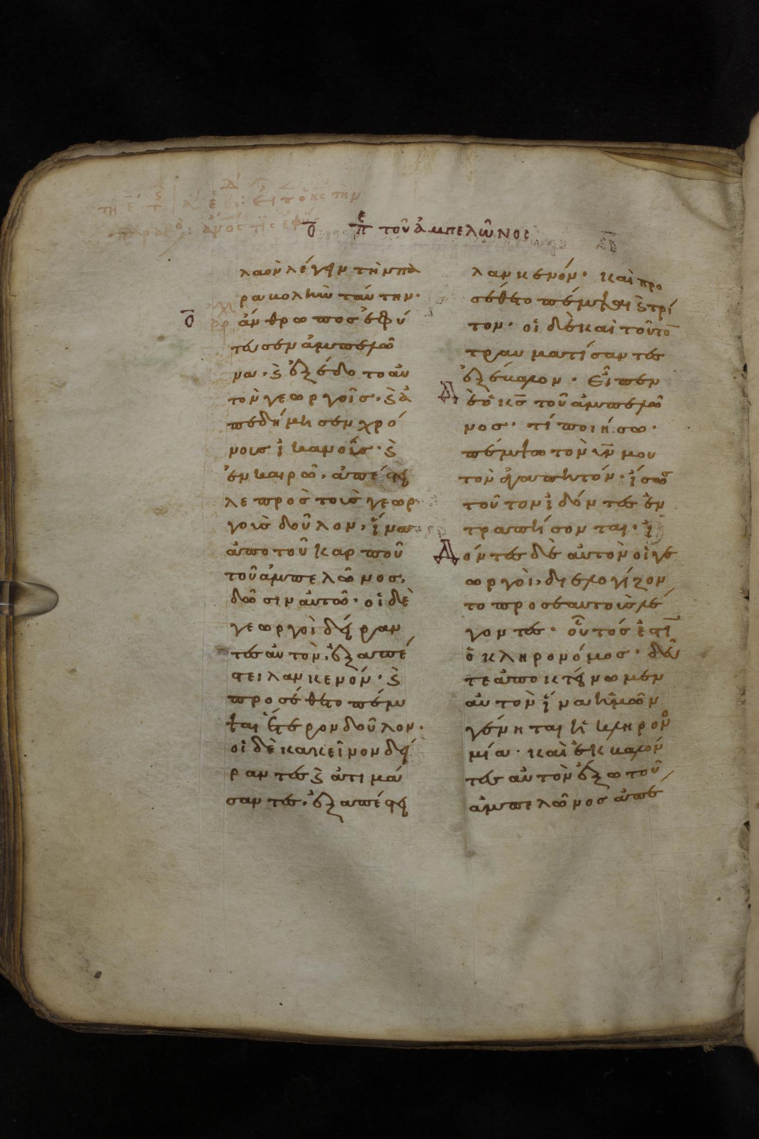 Eleventh century minuscule of the Gospels on parchment; 266 leaves, 2 column, 22 lines per column. Images were taken at the National Library of Greece in Athens.