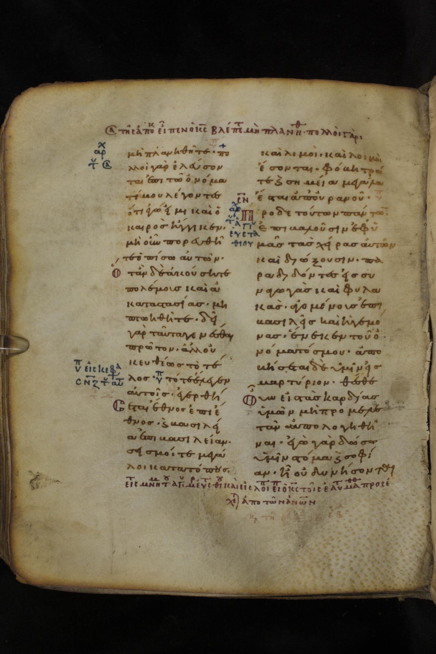 Eleventh century minuscule of the Gospels on parchment; 266 leaves, 2 column, 22 lines per column. Images were taken at the National Library of Greece in Athens.