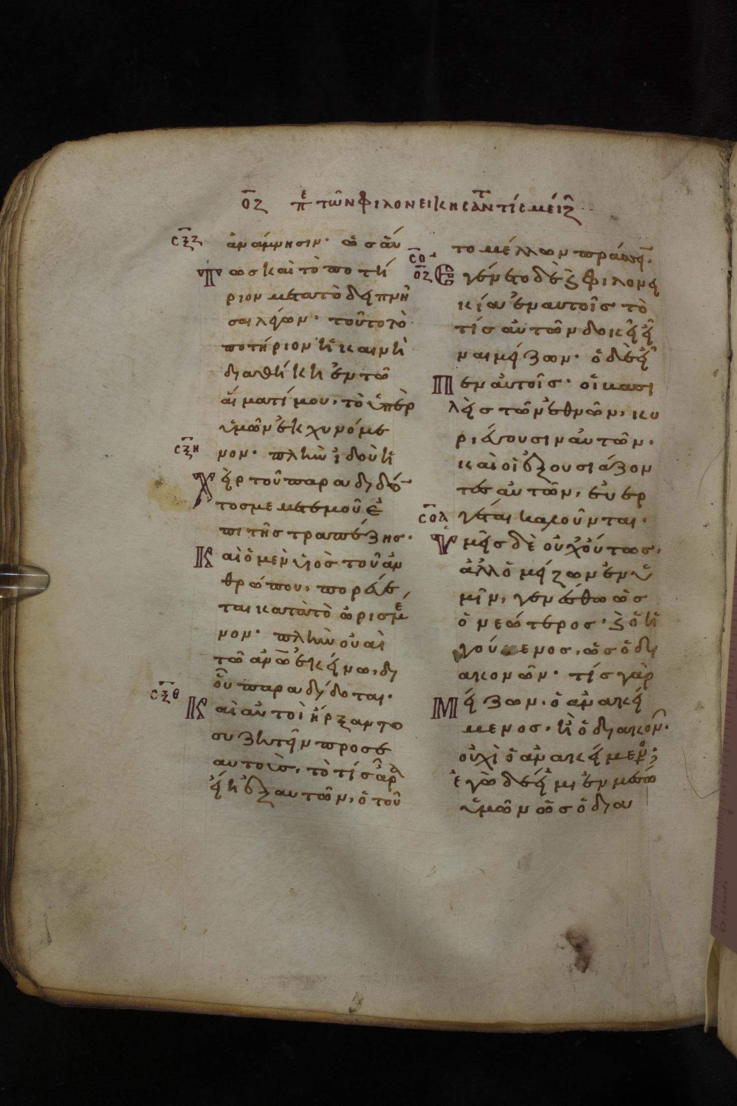 Eleventh century minuscule of the Gospels on parchment; 266 leaves, 2 column, 22 lines per column. Images were taken at the National Library of Greece in Athens.