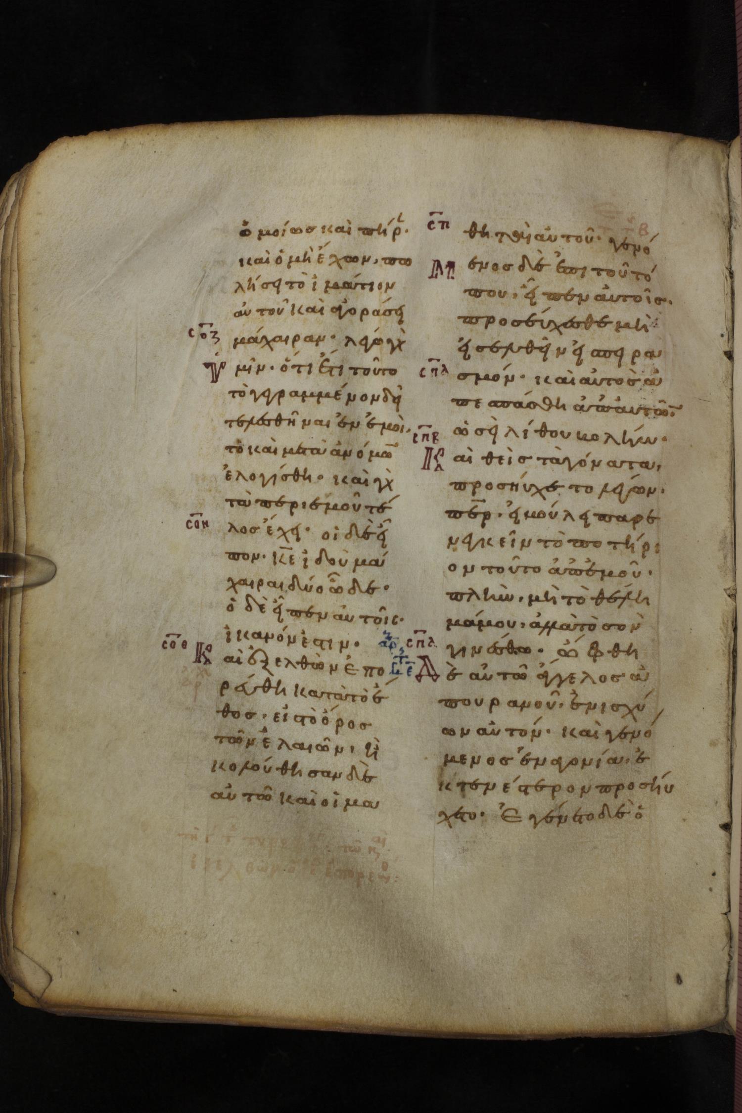 Eleventh century minuscule of the Gospels on parchment; 266 leaves, 2 column, 22 lines per column. Images were taken at the National Library of Greece in Athens.