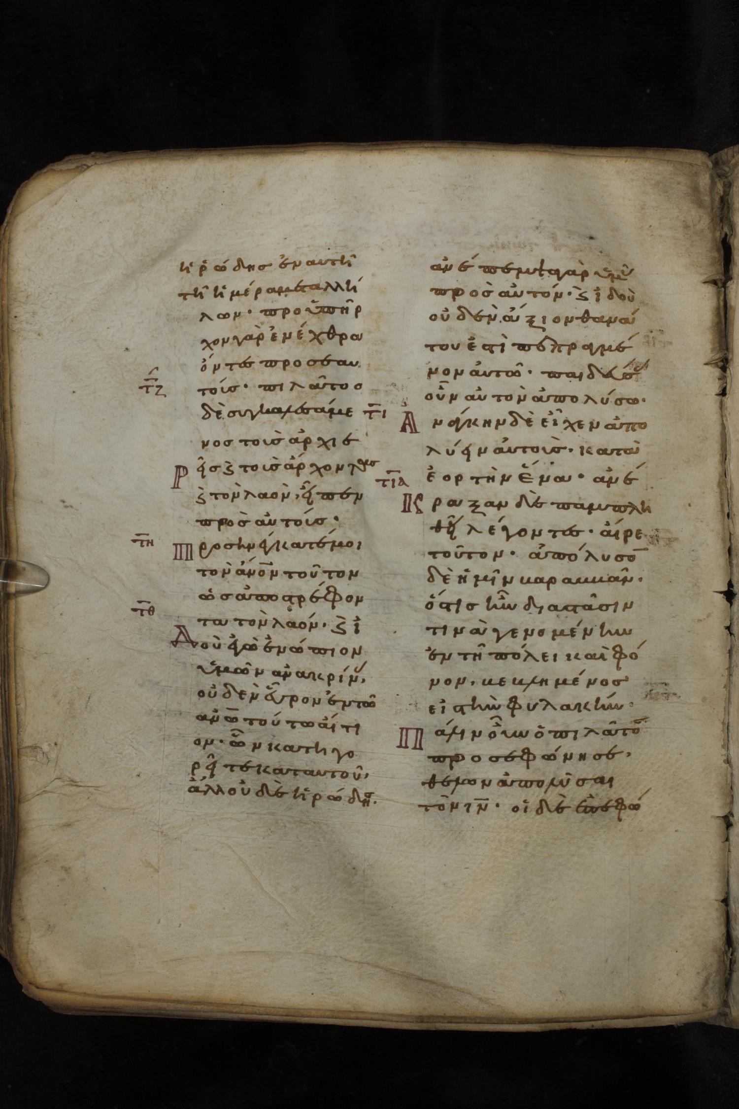 Eleventh century minuscule of the Gospels on parchment; 266 leaves, 2 column, 22 lines per column. Images were taken at the National Library of Greece in Athens.