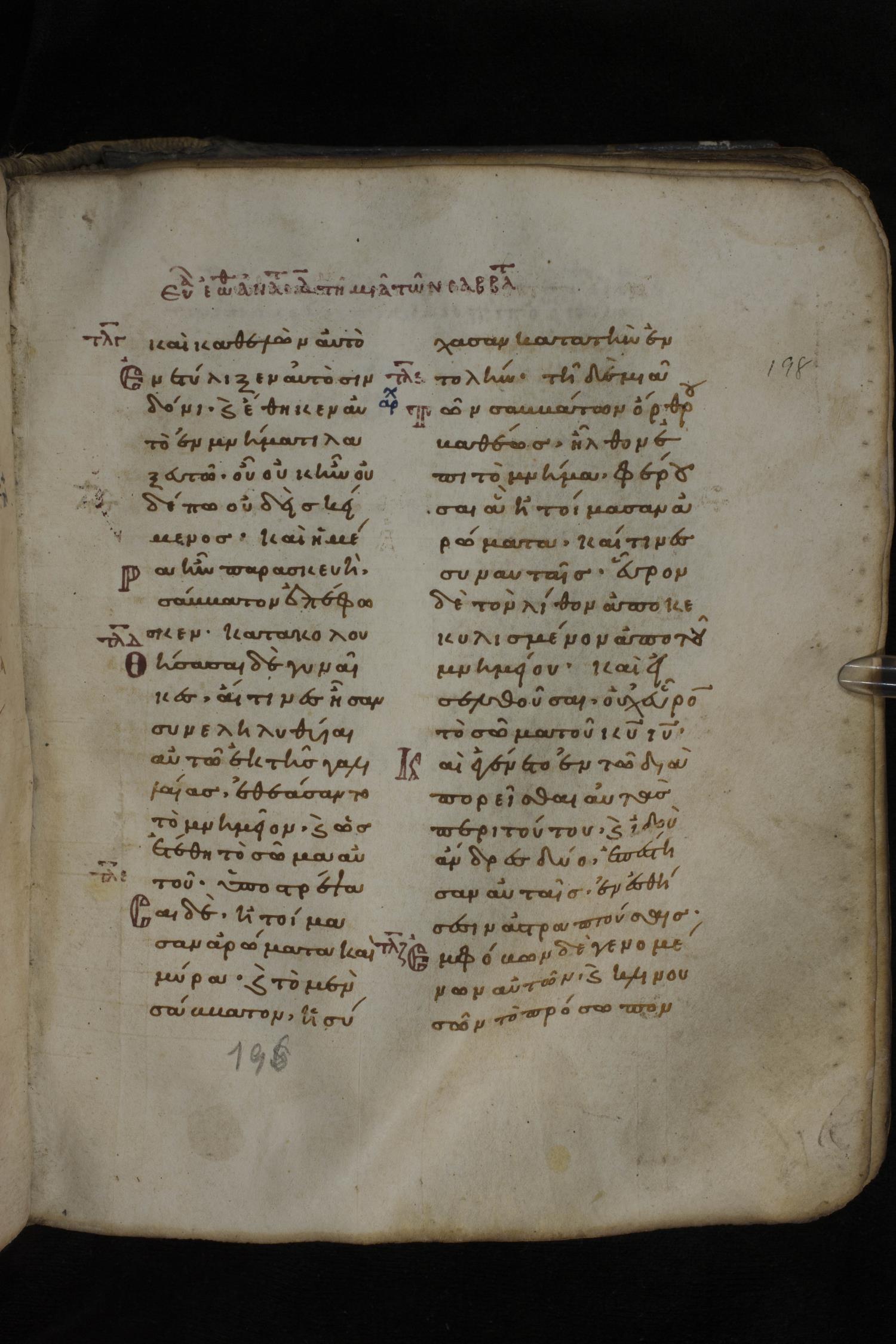 Eleventh century minuscule of the Gospels on parchment; 266 leaves, 2 column, 22 lines per column. Images were taken at the National Library of Greece in Athens.