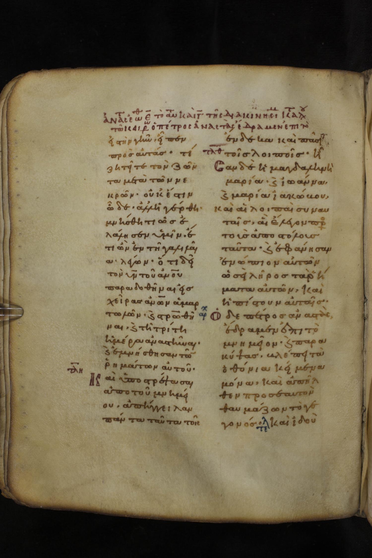 Eleventh century minuscule of the Gospels on parchment; 266 leaves, 2 column, 22 lines per column. Images were taken at the National Library of Greece in Athens.