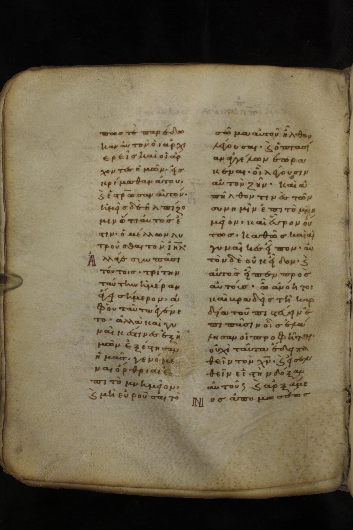Eleventh century minuscule of the Gospels on parchment; 266 leaves, 2 column, 22 lines per column. Images were taken at the National Library of Greece in Athens.