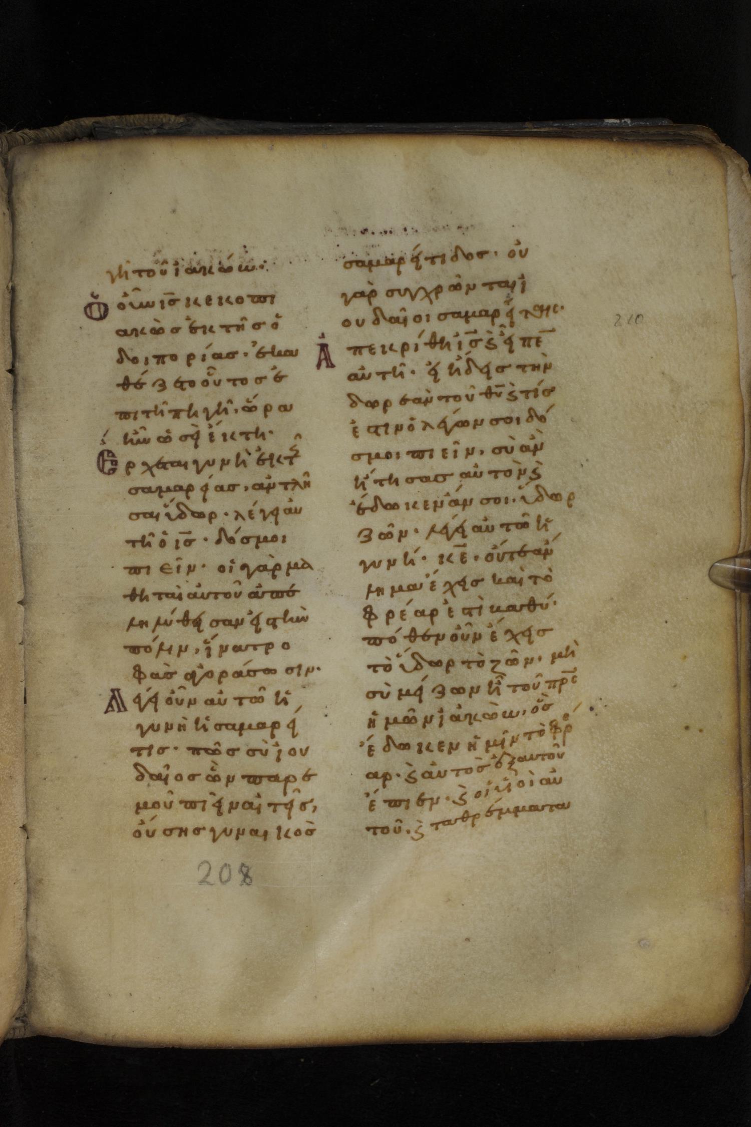 Eleventh century minuscule of the Gospels on parchment; 266 leaves, 2 column, 22 lines per column. Images were taken at the National Library of Greece in Athens.