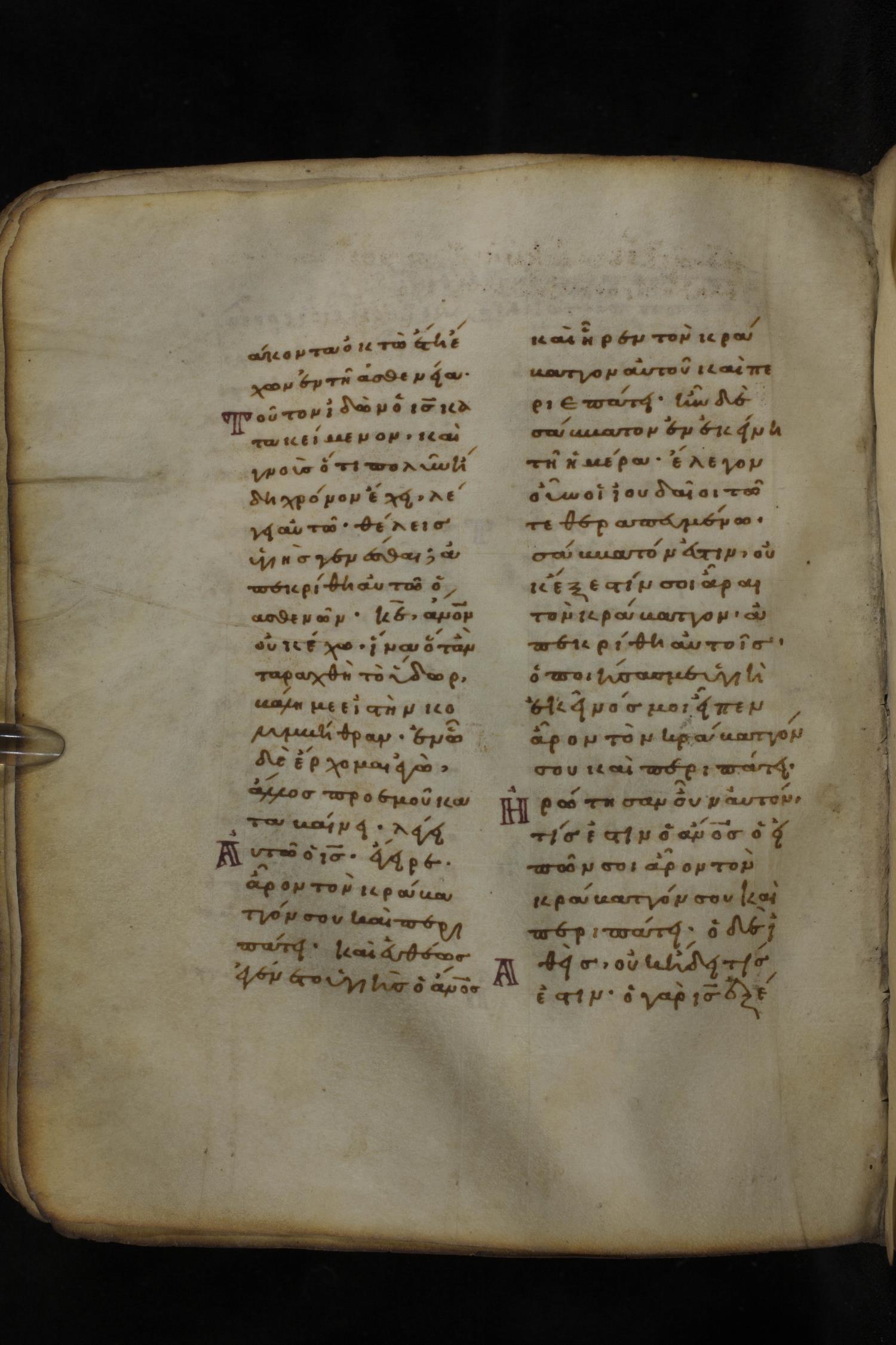 Eleventh century minuscule of the Gospels on parchment; 266 leaves, 2 column, 22 lines per column. Images were taken at the National Library of Greece in Athens.