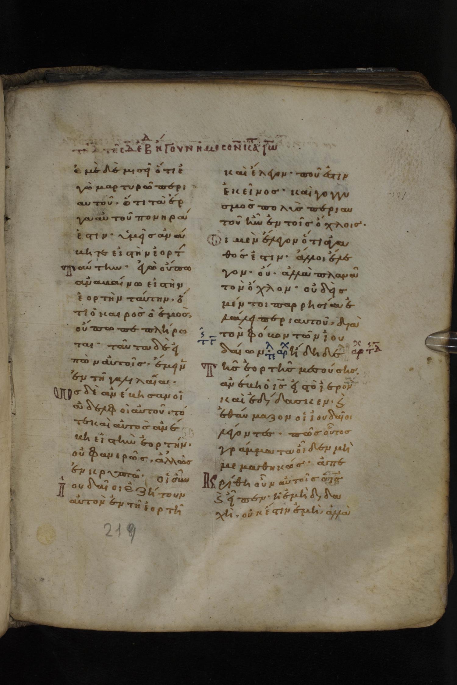 Eleventh century minuscule of the Gospels on parchment; 266 leaves, 2 column, 22 lines per column. Images were taken at the National Library of Greece in Athens.