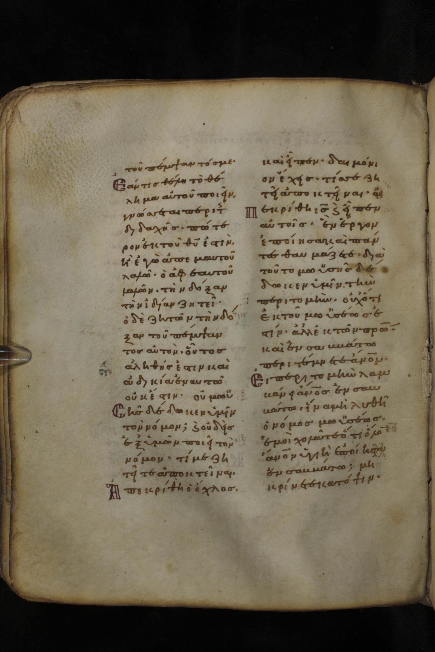 Eleventh century minuscule of the Gospels on parchment; 266 leaves, 2 column, 22 lines per column. Images were taken at the National Library of Greece in Athens.