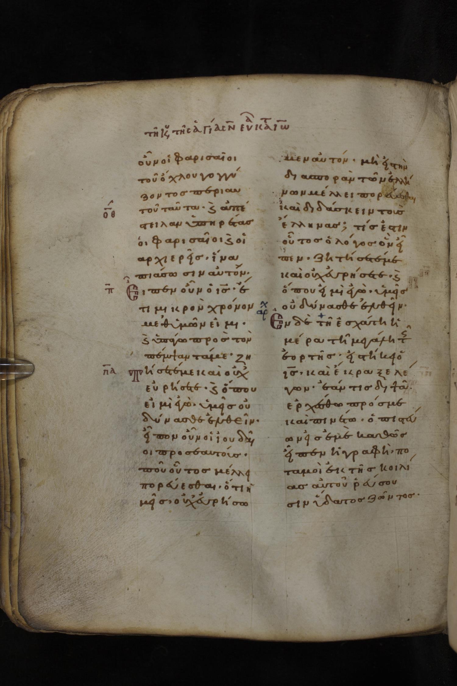 Eleventh century minuscule of the Gospels on parchment; 266 leaves, 2 column, 22 lines per column. Images were taken at the National Library of Greece in Athens.