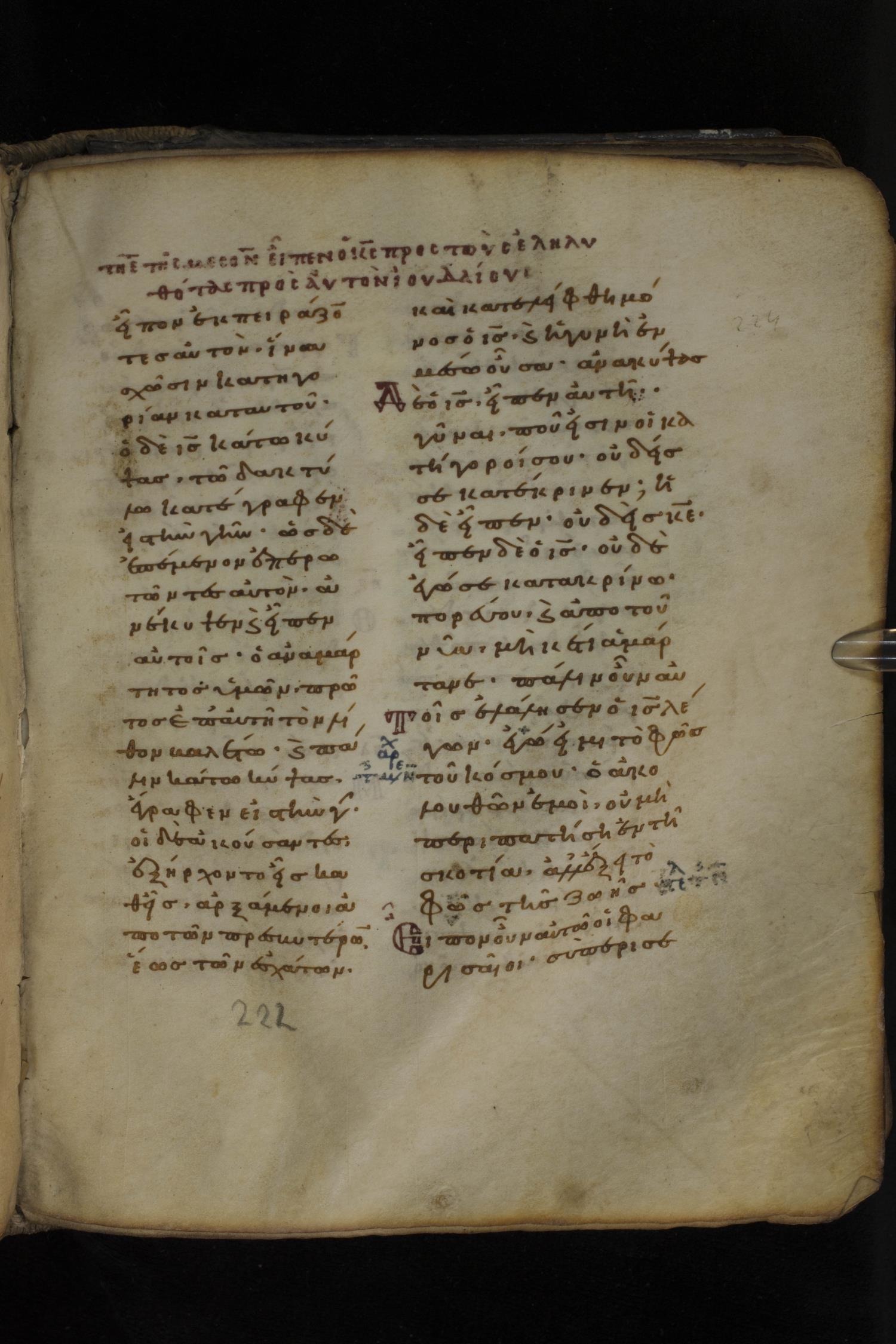 Eleventh century minuscule of the Gospels on parchment; 266 leaves, 2 column, 22 lines per column. Images were taken at the National Library of Greece in Athens.