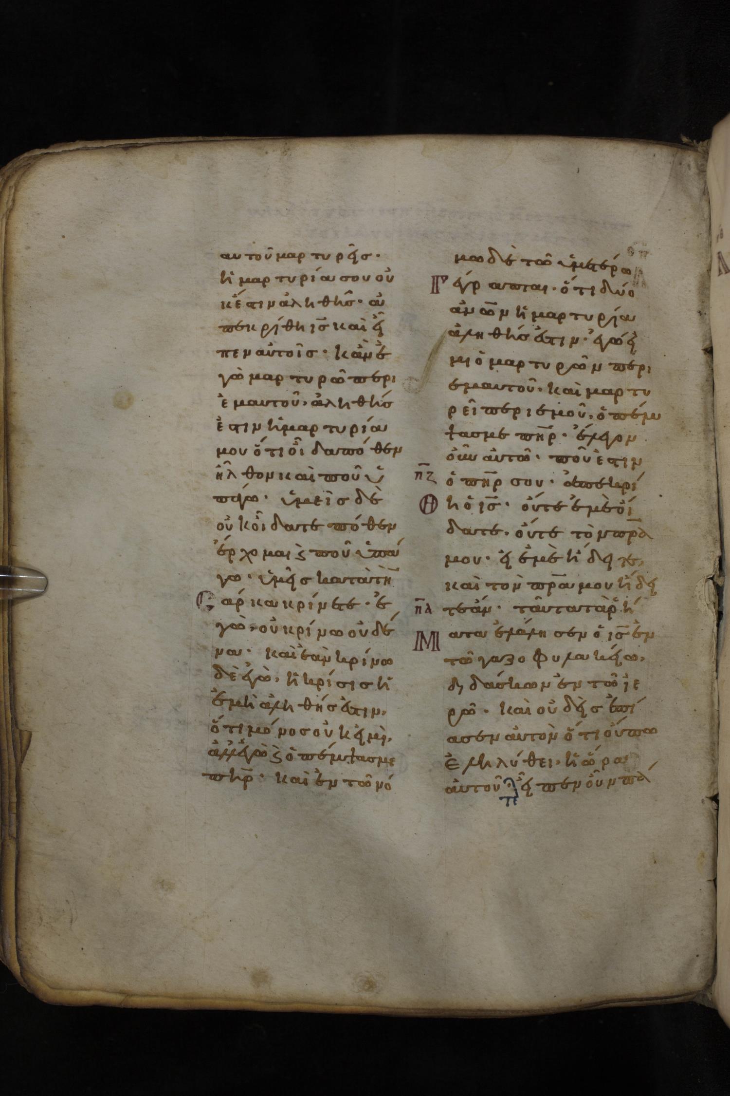 Eleventh century minuscule of the Gospels on parchment; 266 leaves, 2 column, 22 lines per column. Images were taken at the National Library of Greece in Athens.