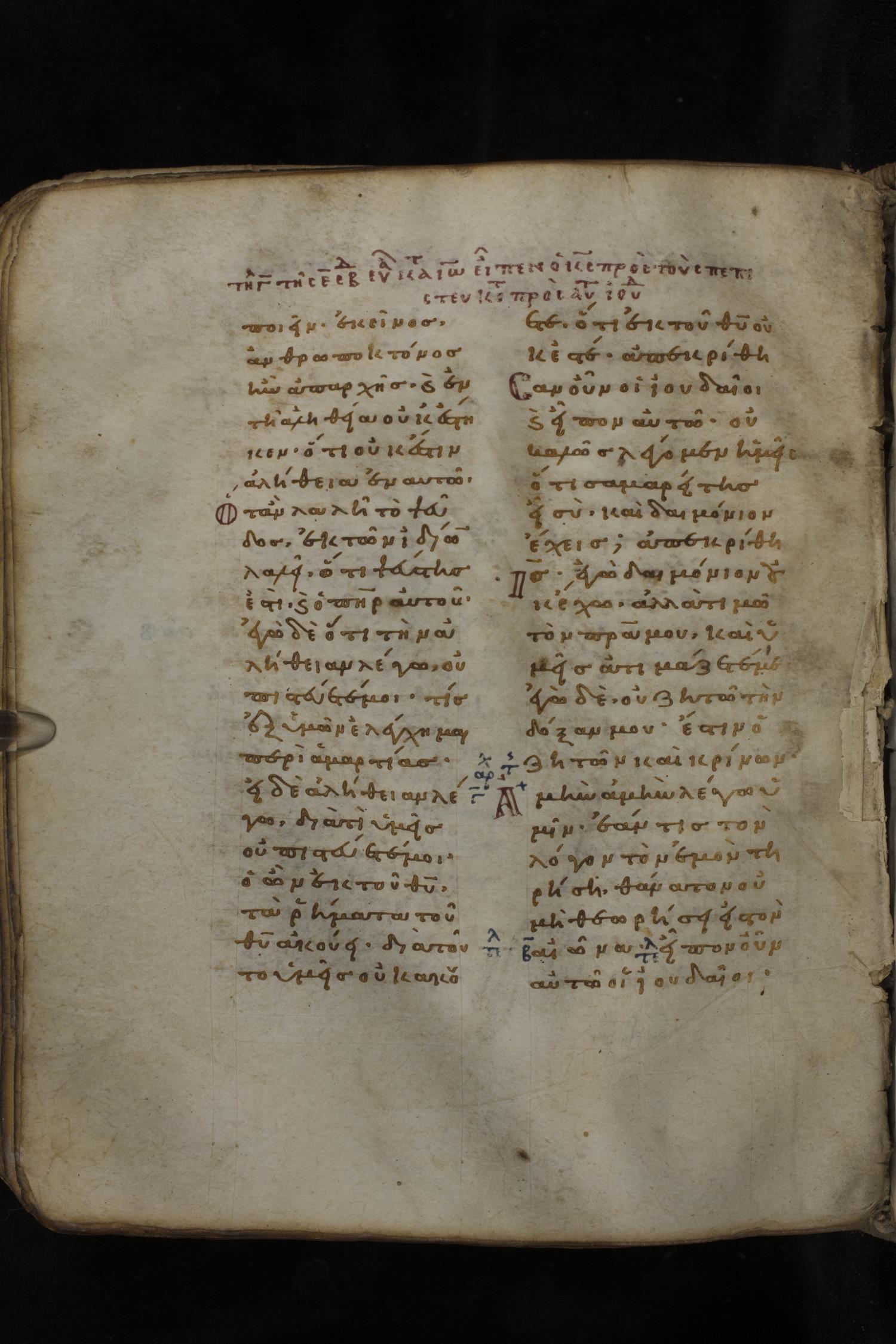 Eleventh century minuscule of the Gospels on parchment; 266 leaves, 2 column, 22 lines per column. Images were taken at the National Library of Greece in Athens.