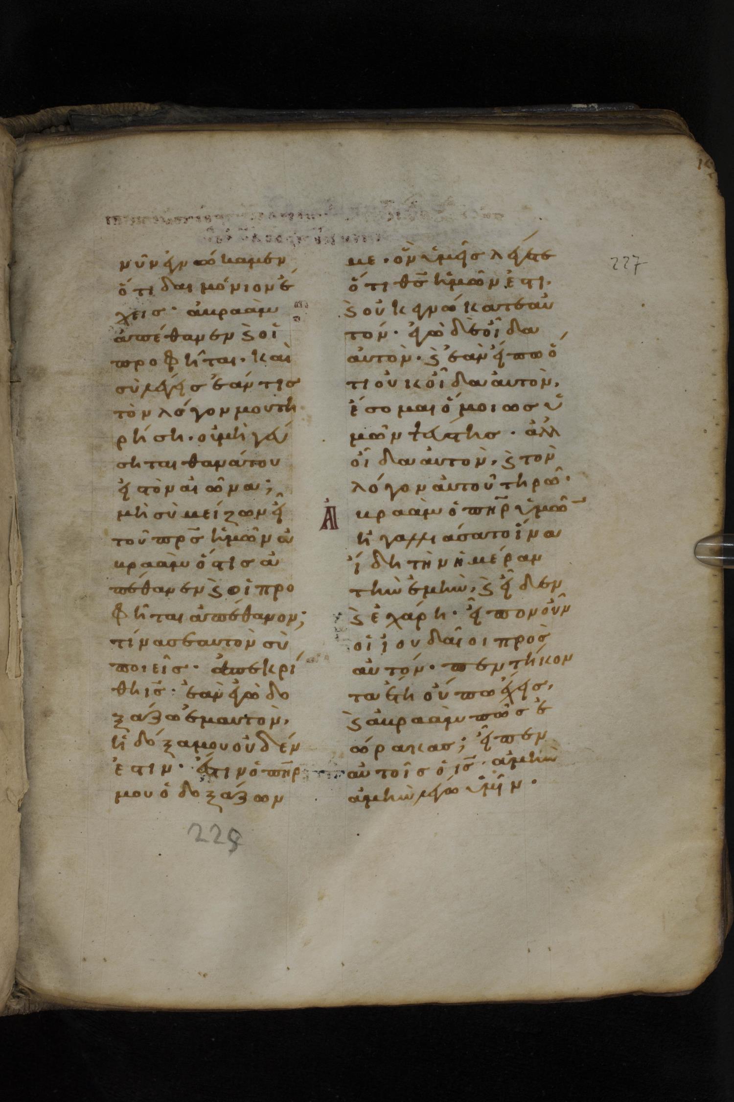 Eleventh century minuscule of the Gospels on parchment; 266 leaves, 2 column, 22 lines per column. Images were taken at the National Library of Greece in Athens.