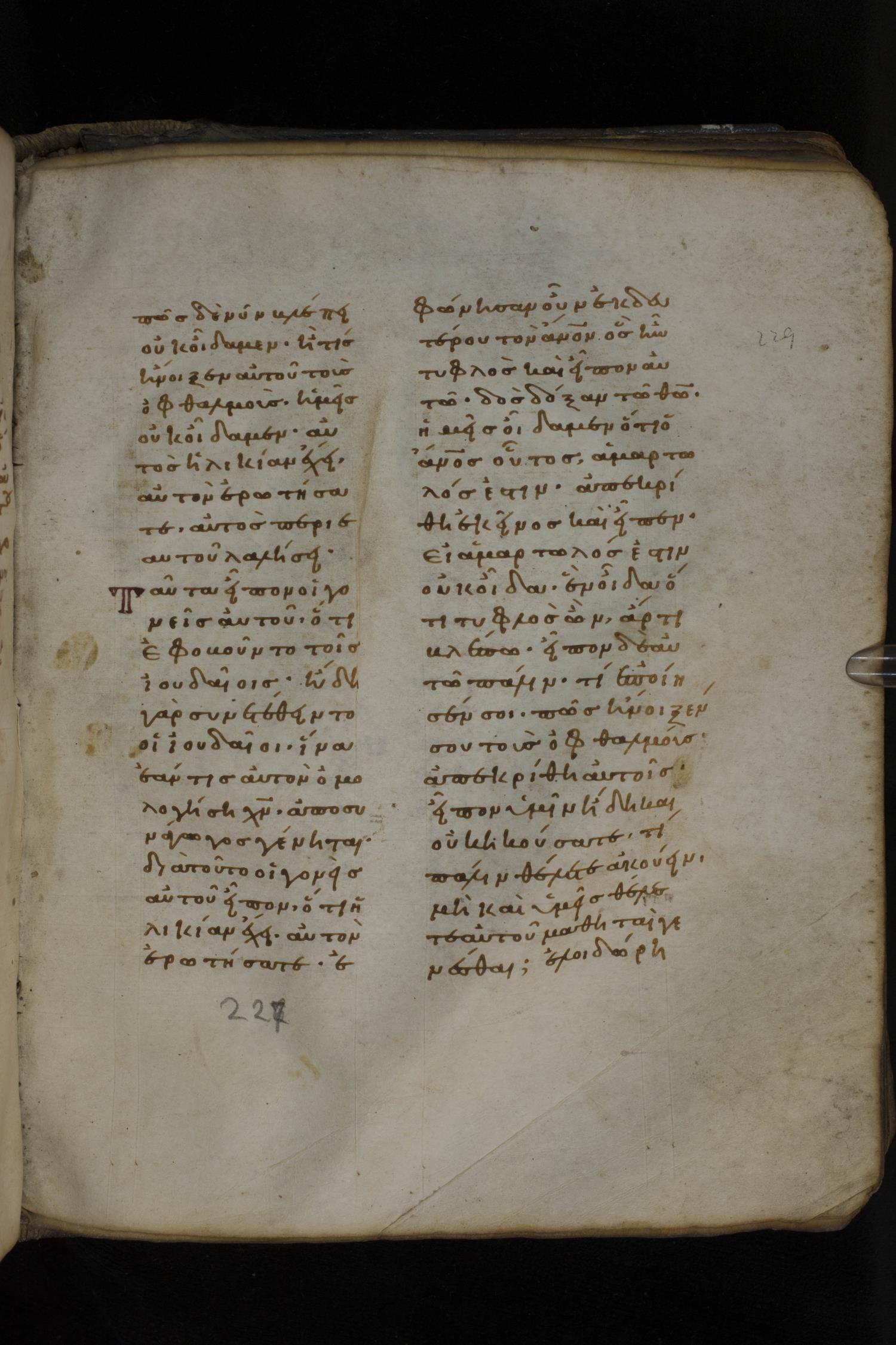 Eleventh century minuscule of the Gospels on parchment; 266 leaves, 2 column, 22 lines per column. Images were taken at the National Library of Greece in Athens.