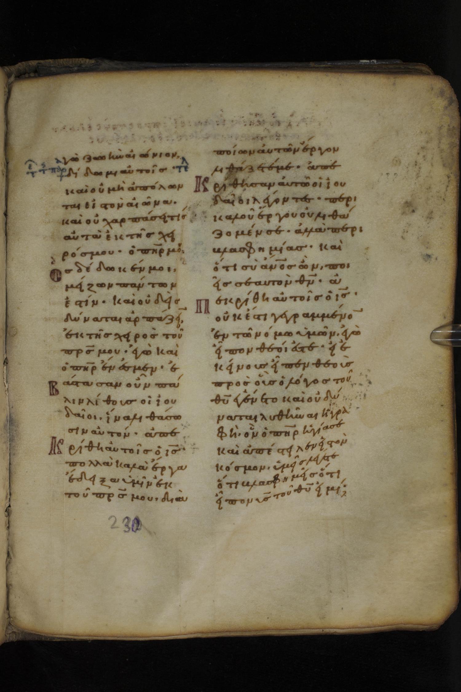 Eleventh century minuscule of the Gospels on parchment; 266 leaves, 2 column, 22 lines per column. Images were taken at the National Library of Greece in Athens.