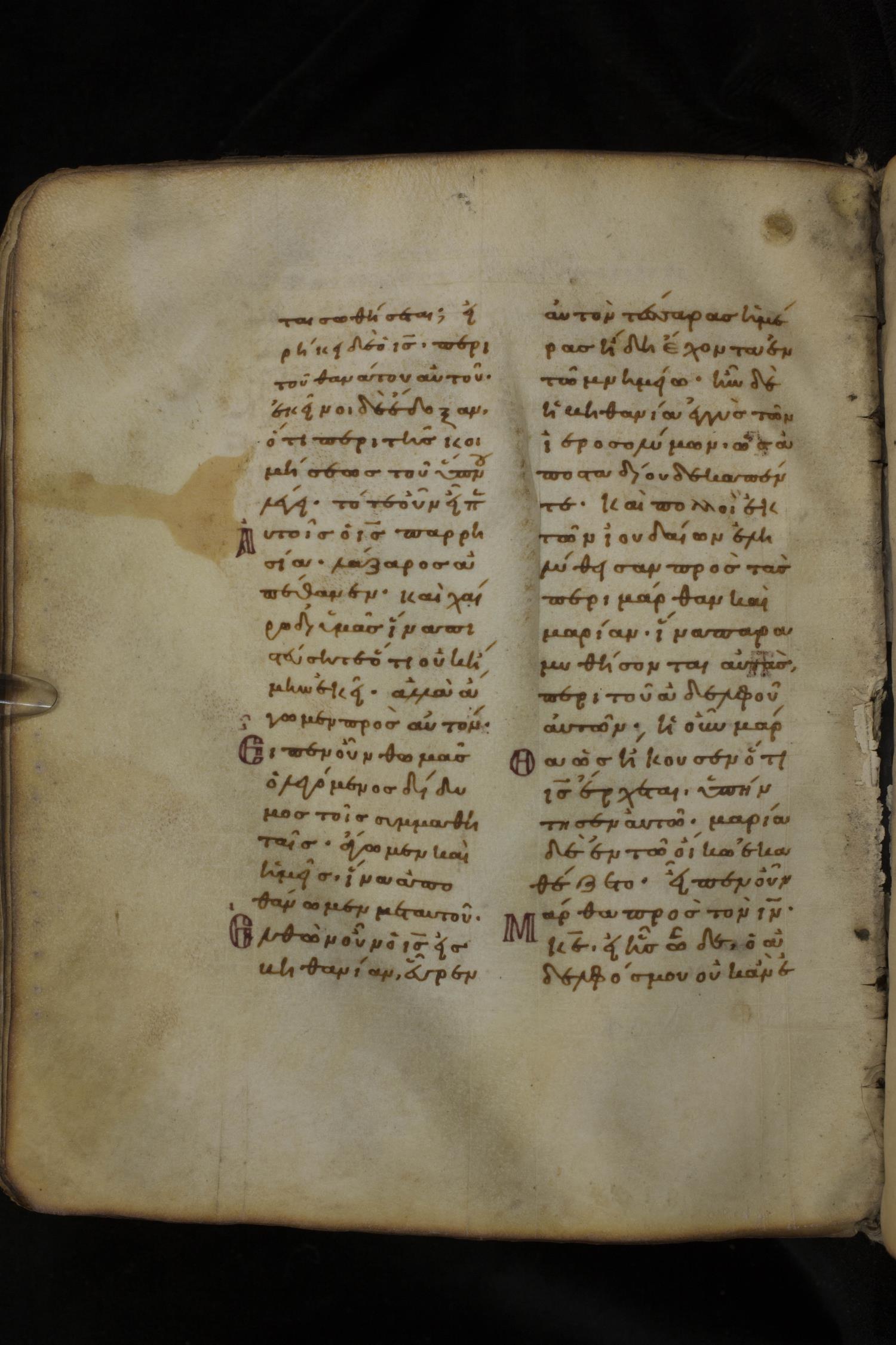 Eleventh century minuscule of the Gospels on parchment; 266 leaves, 2 column, 22 lines per column. Images were taken at the National Library of Greece in Athens.