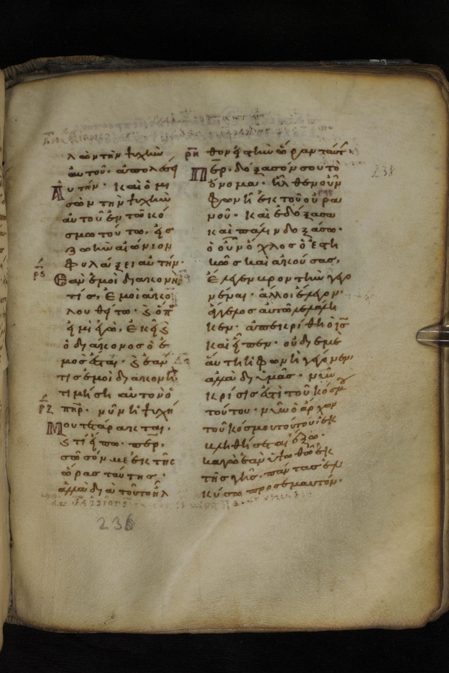 Eleventh century minuscule of the Gospels on parchment; 266 leaves, 2 column, 22 lines per column. Images were taken at the National Library of Greece in Athens.