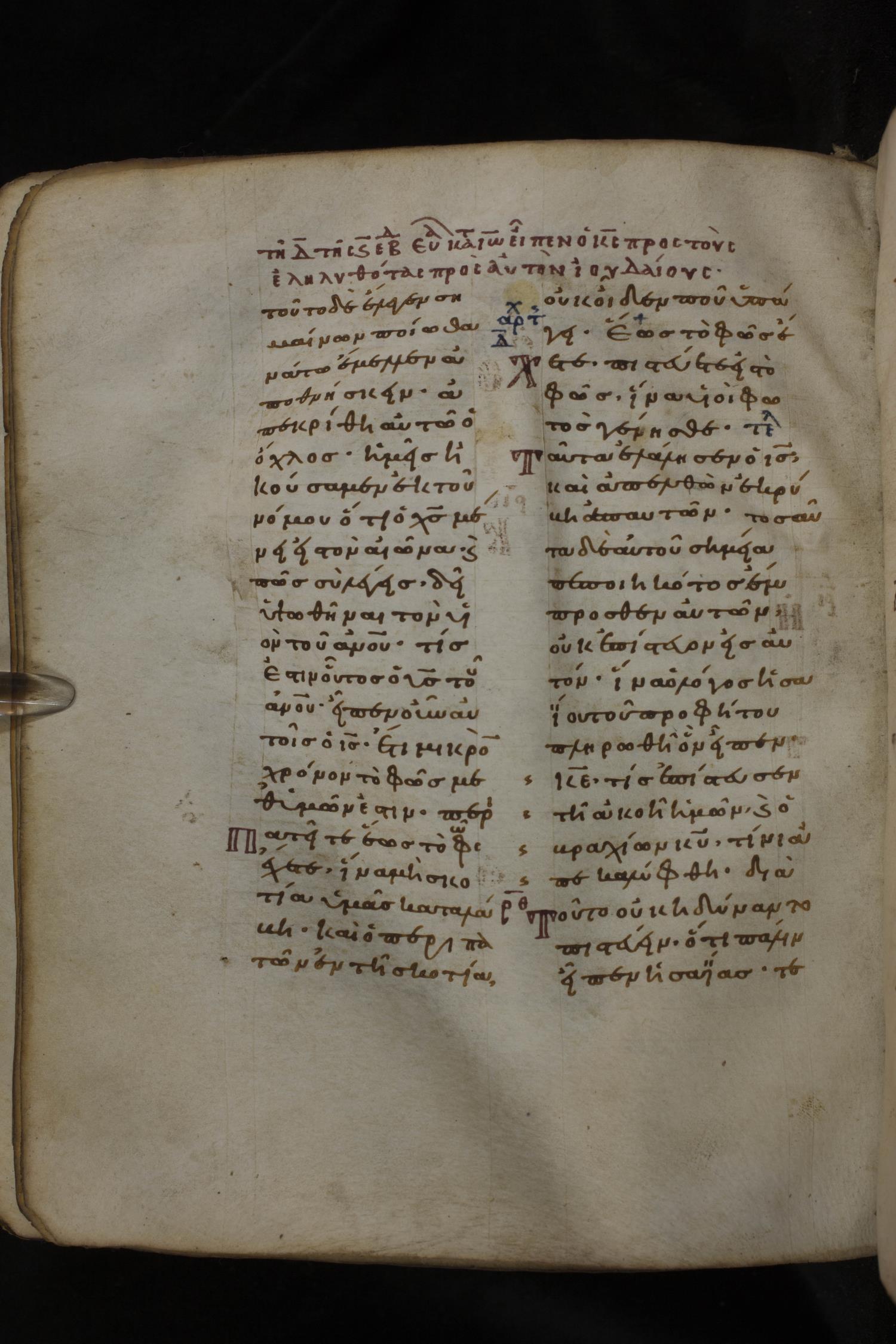 Eleventh century minuscule of the Gospels on parchment; 266 leaves, 2 column, 22 lines per column. Images were taken at the National Library of Greece in Athens.