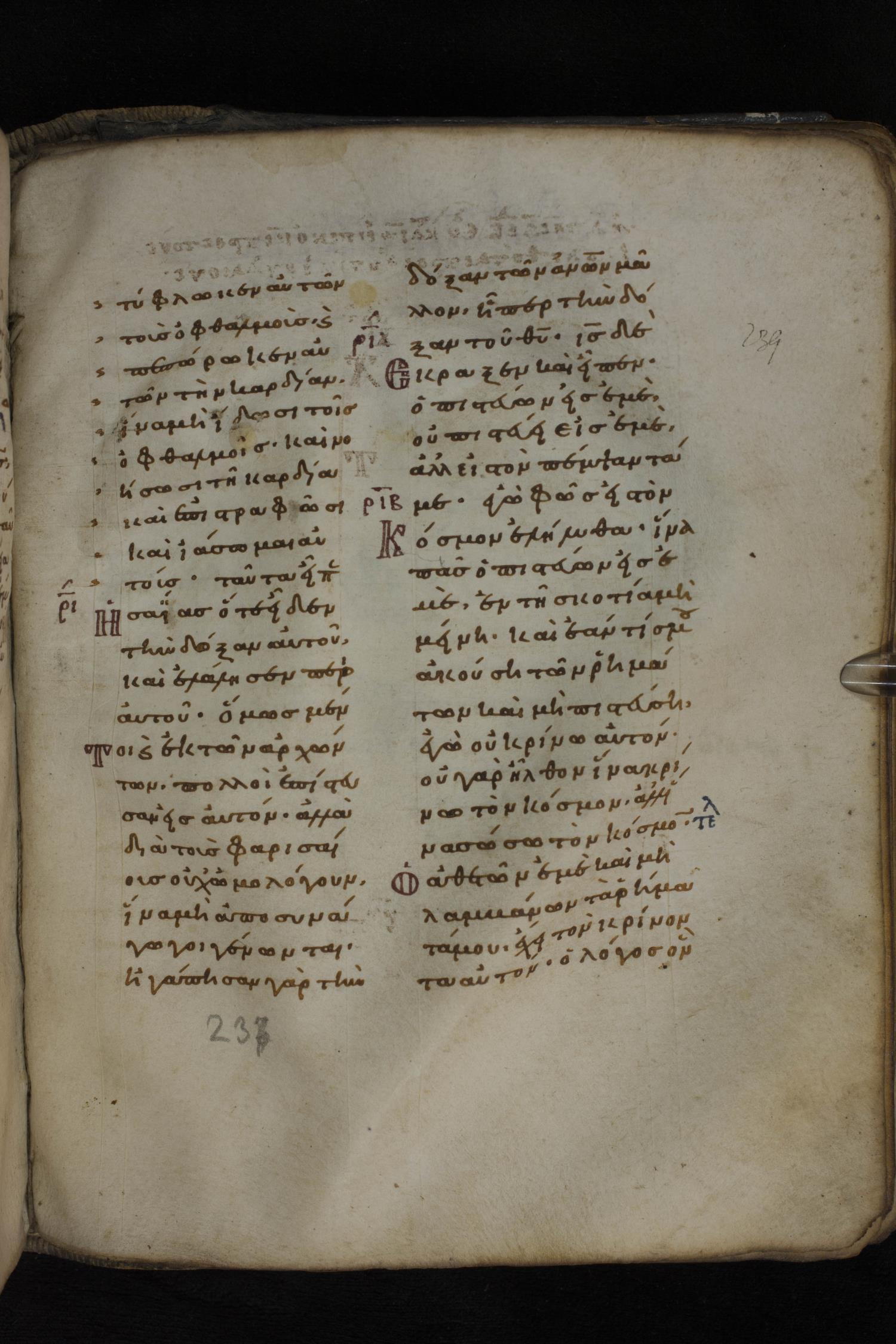 Eleventh century minuscule of the Gospels on parchment; 266 leaves, 2 column, 22 lines per column. Images were taken at the National Library of Greece in Athens.