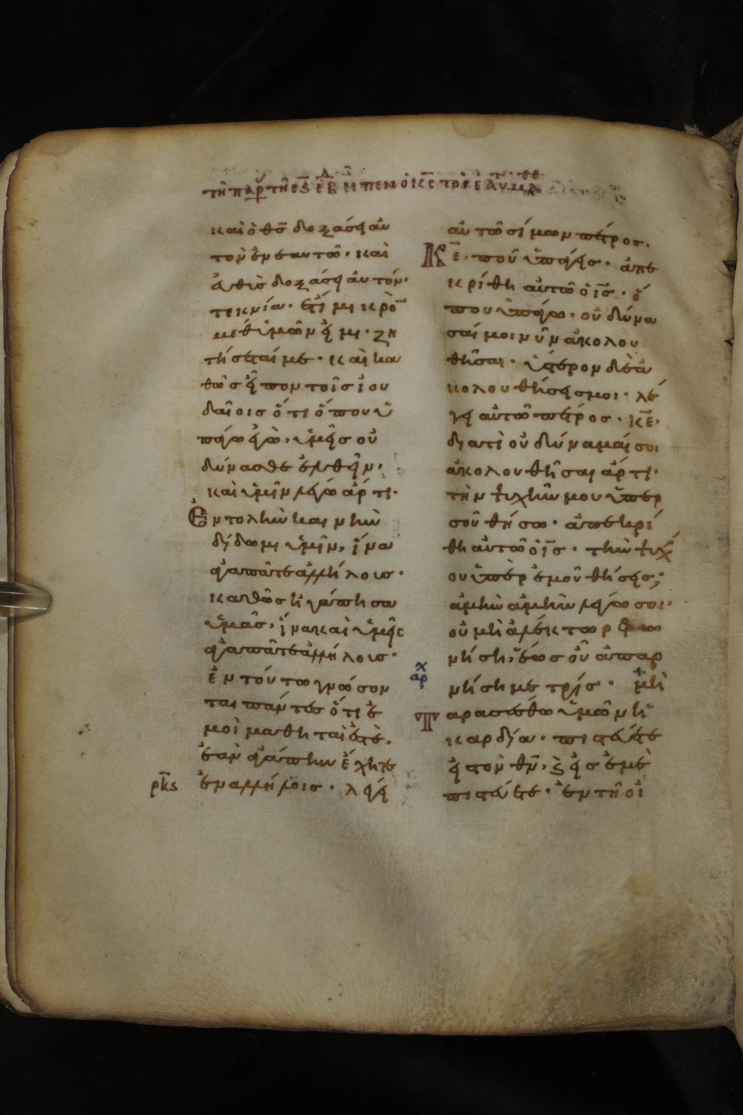 Eleventh century minuscule of the Gospels on parchment; 266 leaves, 2 column, 22 lines per column. Images were taken at the National Library of Greece in Athens.