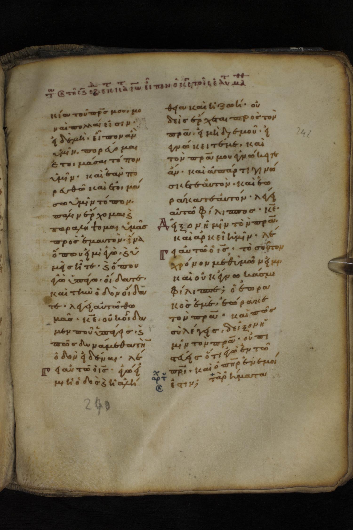 Eleventh century minuscule of the Gospels on parchment; 266 leaves, 2 column, 22 lines per column. Images were taken at the National Library of Greece in Athens.