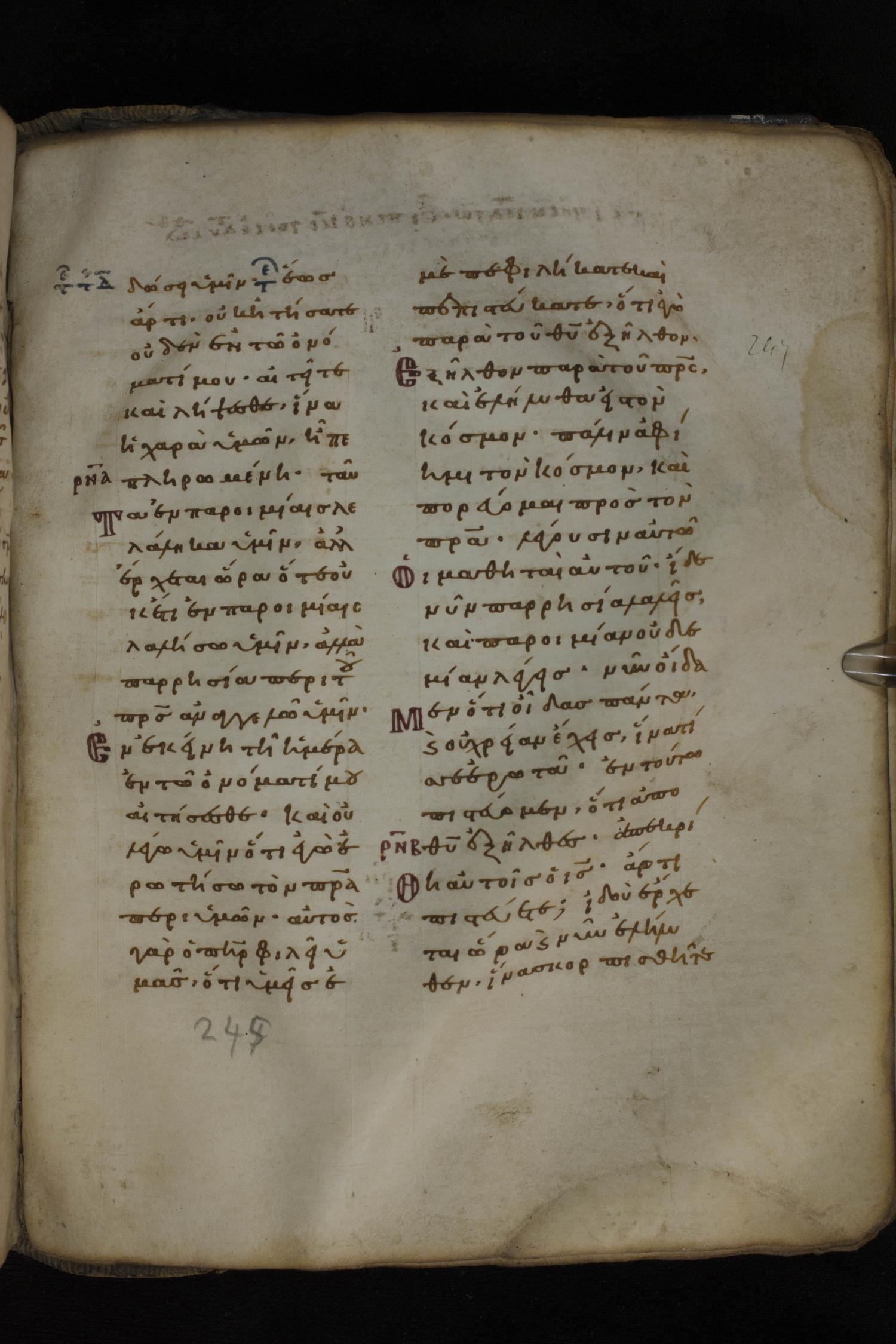 Eleventh century minuscule of the Gospels on parchment; 266 leaves, 2 column, 22 lines per column. Images were taken at the National Library of Greece in Athens.