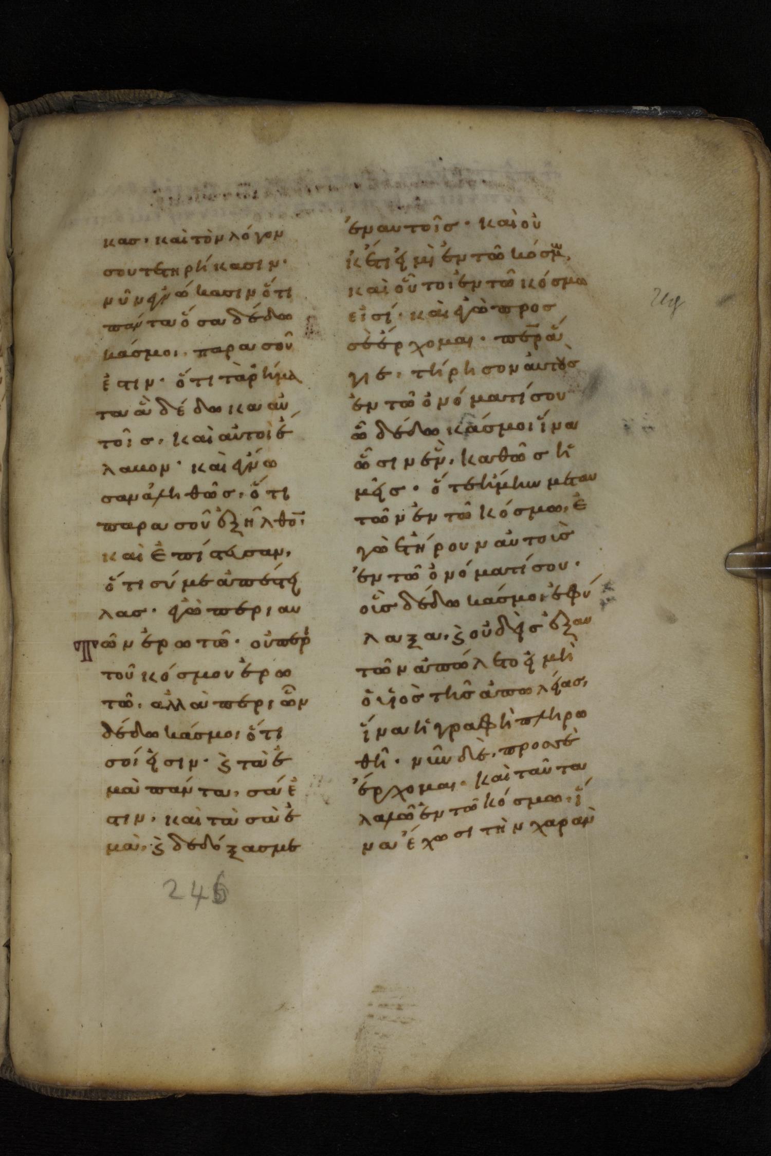 Eleventh century minuscule of the Gospels on parchment; 266 leaves, 2 column, 22 lines per column. Images were taken at the National Library of Greece in Athens.