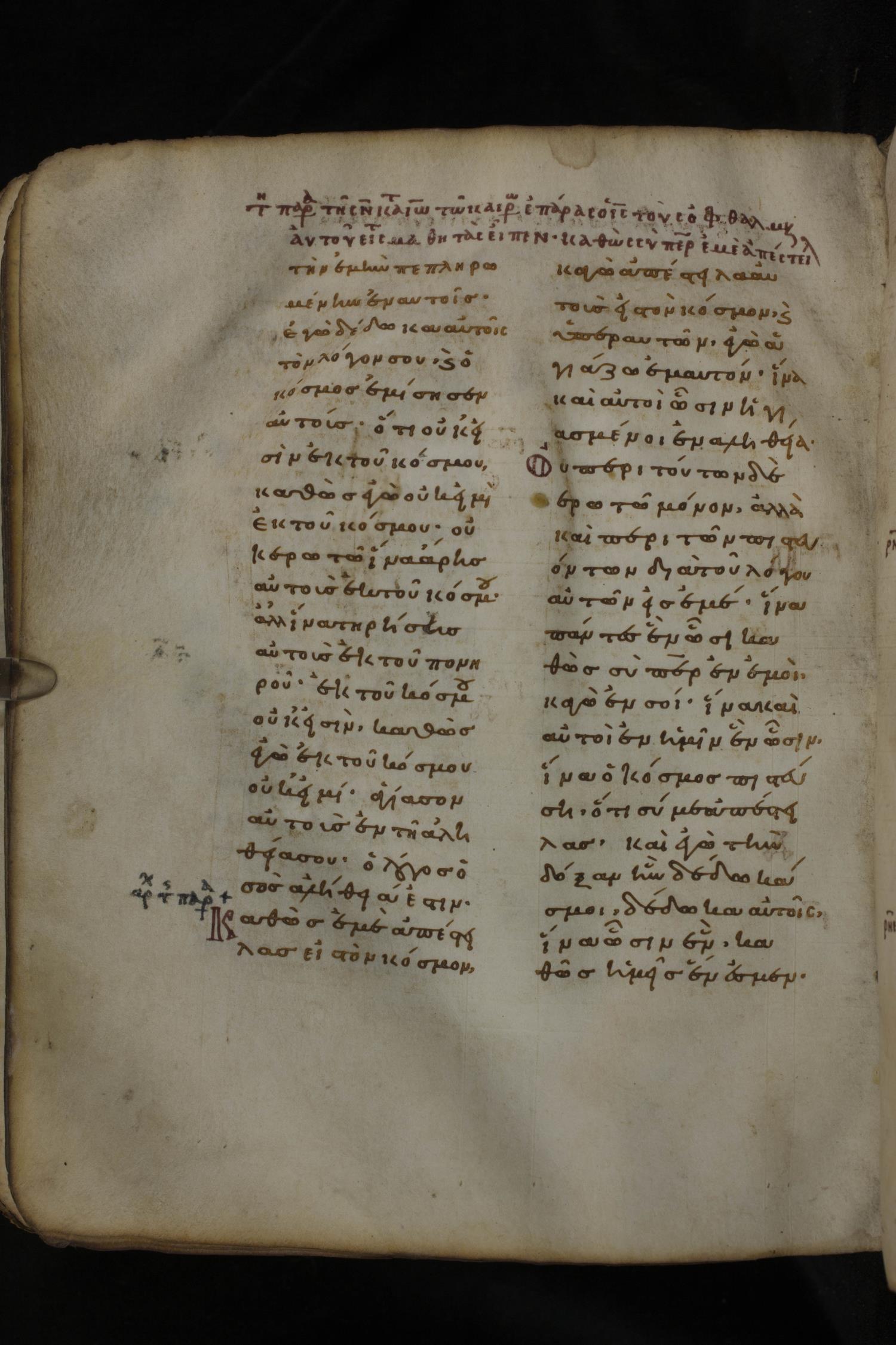Eleventh century minuscule of the Gospels on parchment; 266 leaves, 2 column, 22 lines per column. Images were taken at the National Library of Greece in Athens.