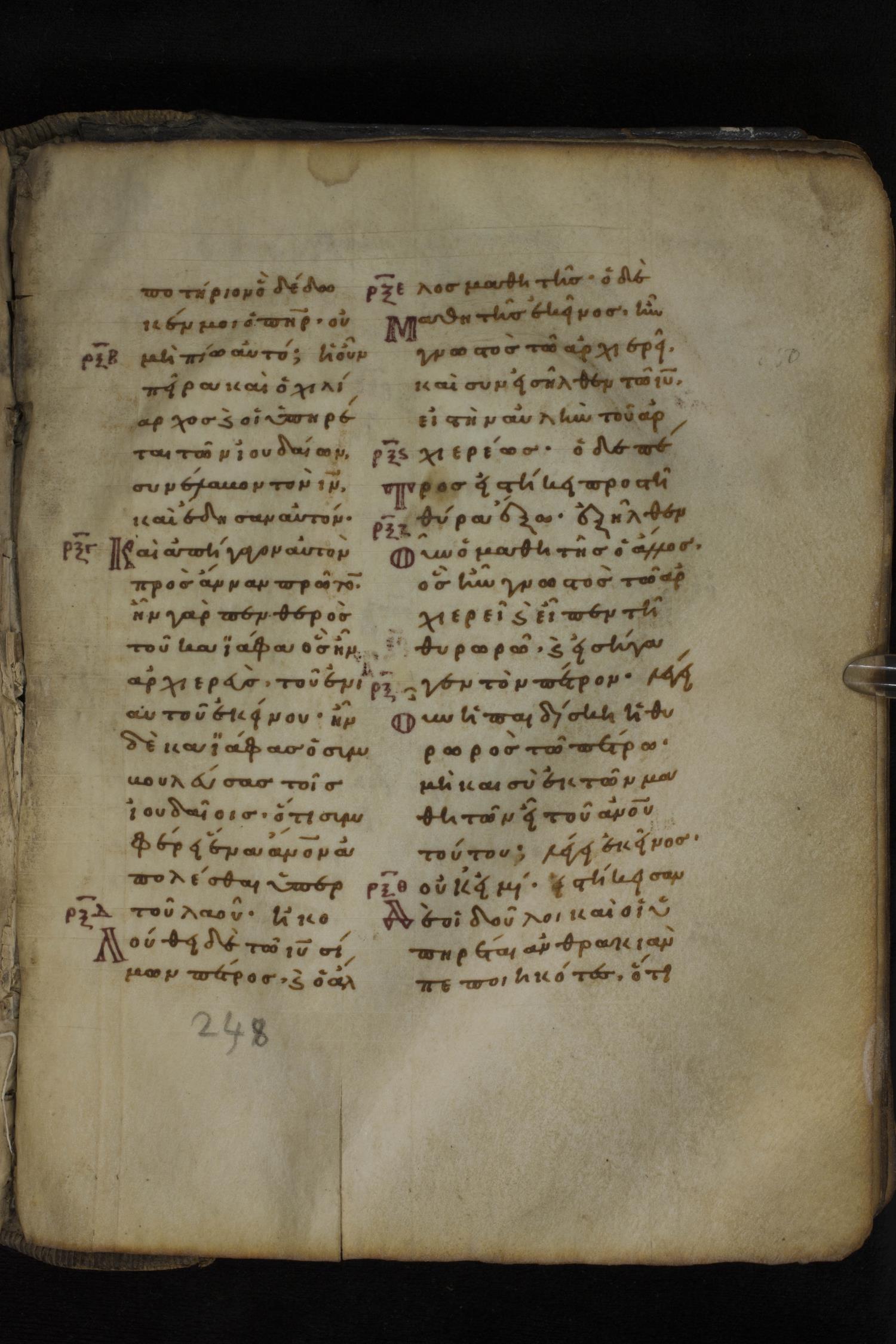 Eleventh century minuscule of the Gospels on parchment; 266 leaves, 2 column, 22 lines per column. Images were taken at the National Library of Greece in Athens.