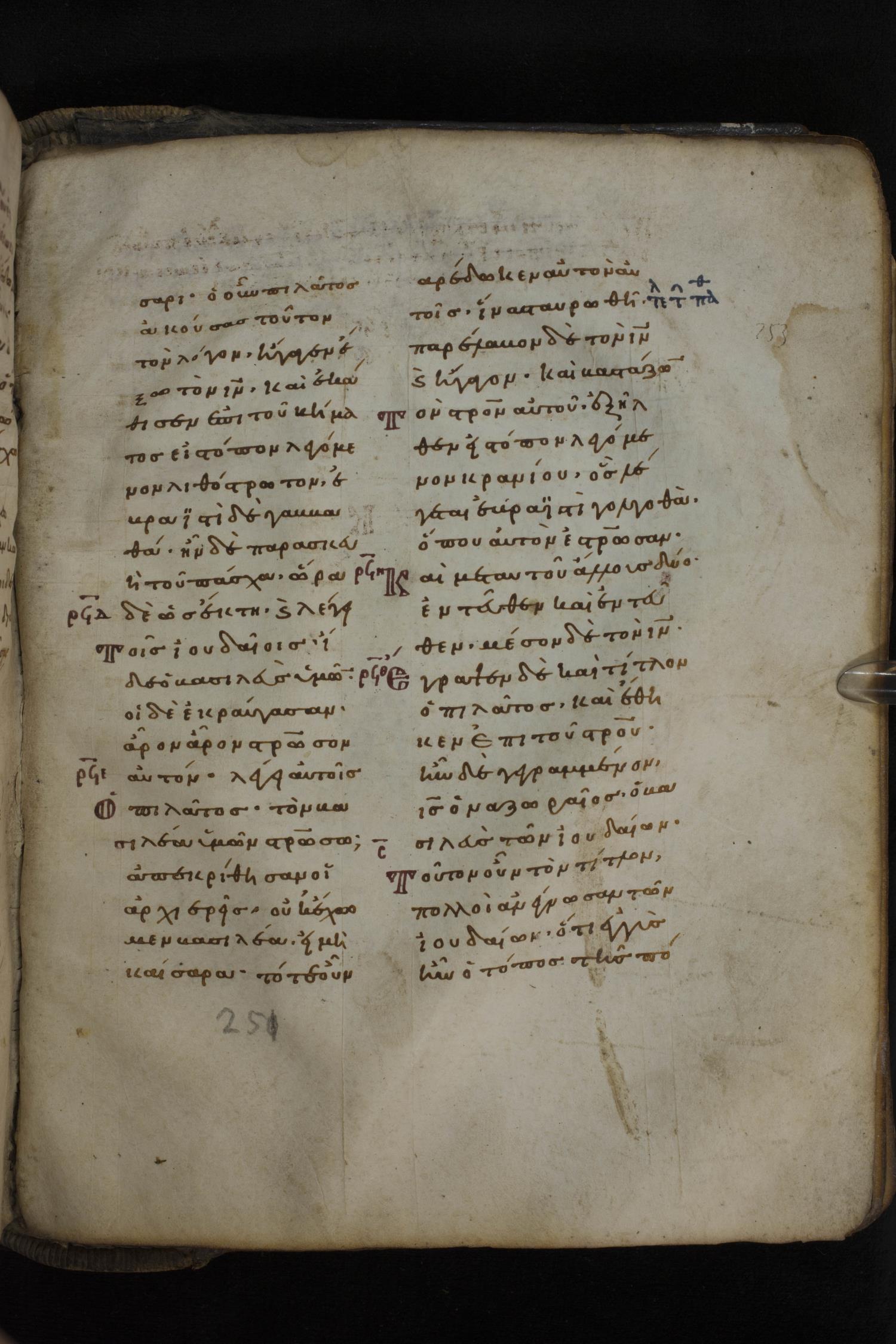 Eleventh century minuscule of the Gospels on parchment; 266 leaves, 2 column, 22 lines per column. Images were taken at the National Library of Greece in Athens.