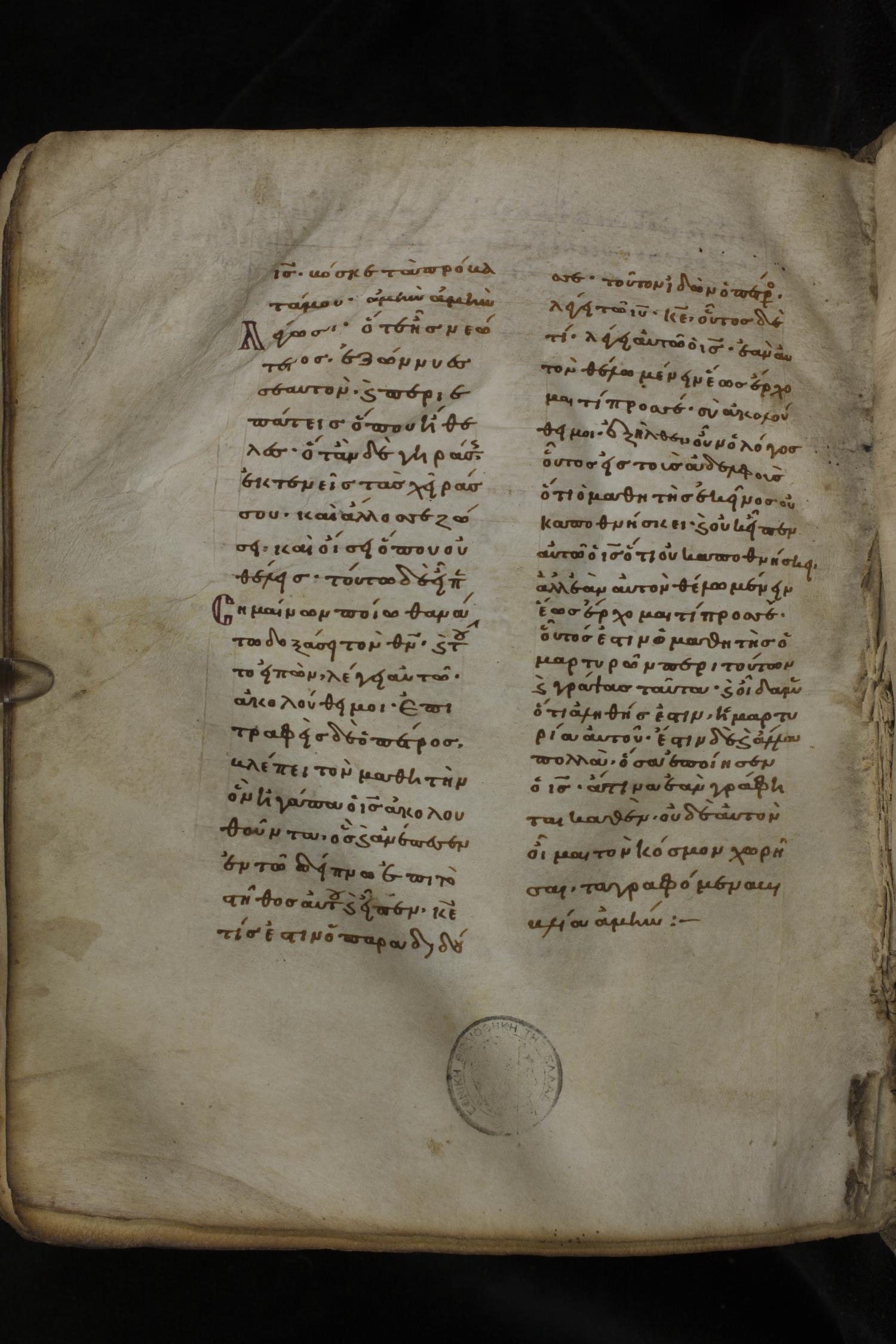 Eleventh century minuscule of the Gospels on parchment; 266 leaves, 2 column, 22 lines per column. Images were taken at the National Library of Greece in Athens.