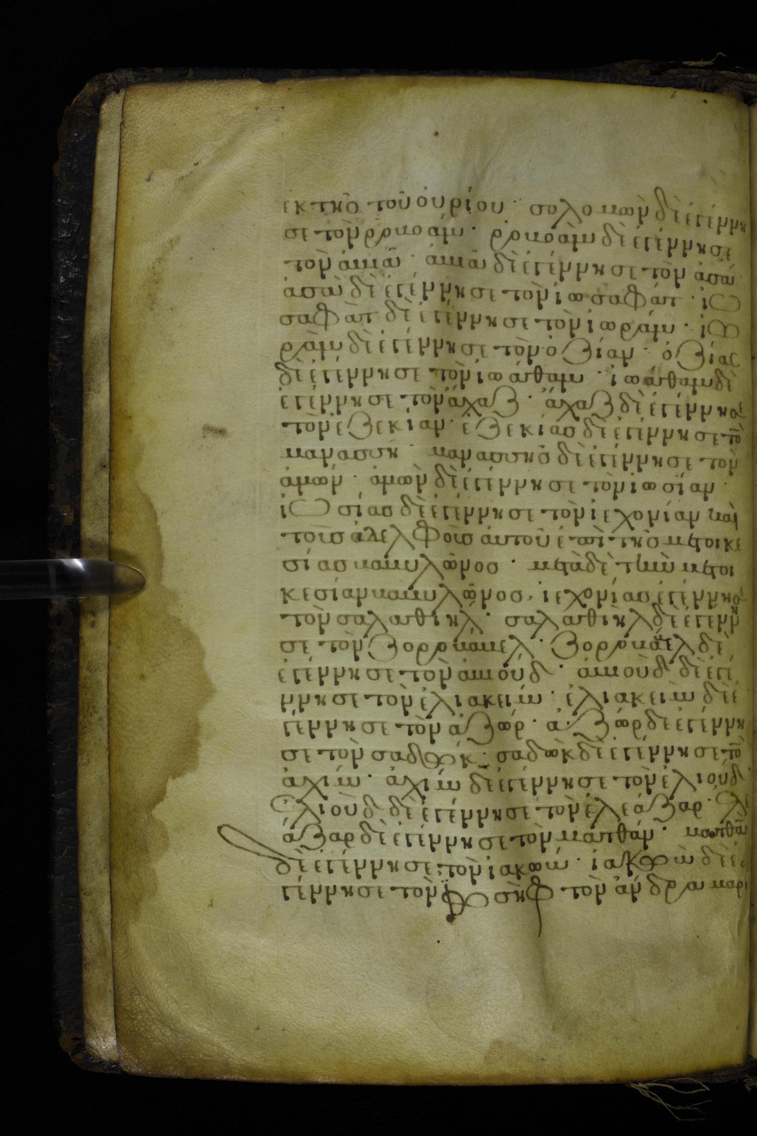 Twelfth century minuscule of the Gospels on parchment; 230 leaves, 1 column, 24-26 lines per column. Images were taken at the National Library of Greece in Athens.