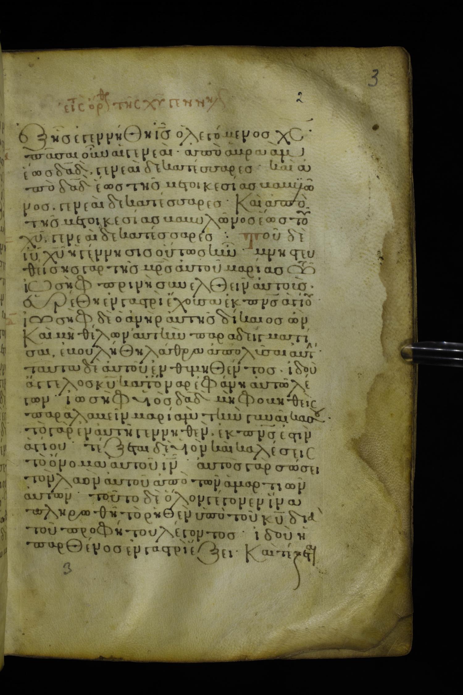 ΤΟΥ ΔΕ ΙΗΣΟΥ ΧΡΙΣΤΟΥ ἡ γένεσις οὕτως ἦν. Μνηστευθείσης τῆς μητρὸς αὐτοῦ Μαρίας τῷ Ἰωσήφ, πρὶν ἢ συνελθεῖν αὐτοὺς εὑρέθη ἐν γαστρὶ ἔχουσα ἐκ πνεύματος ἁγίου.