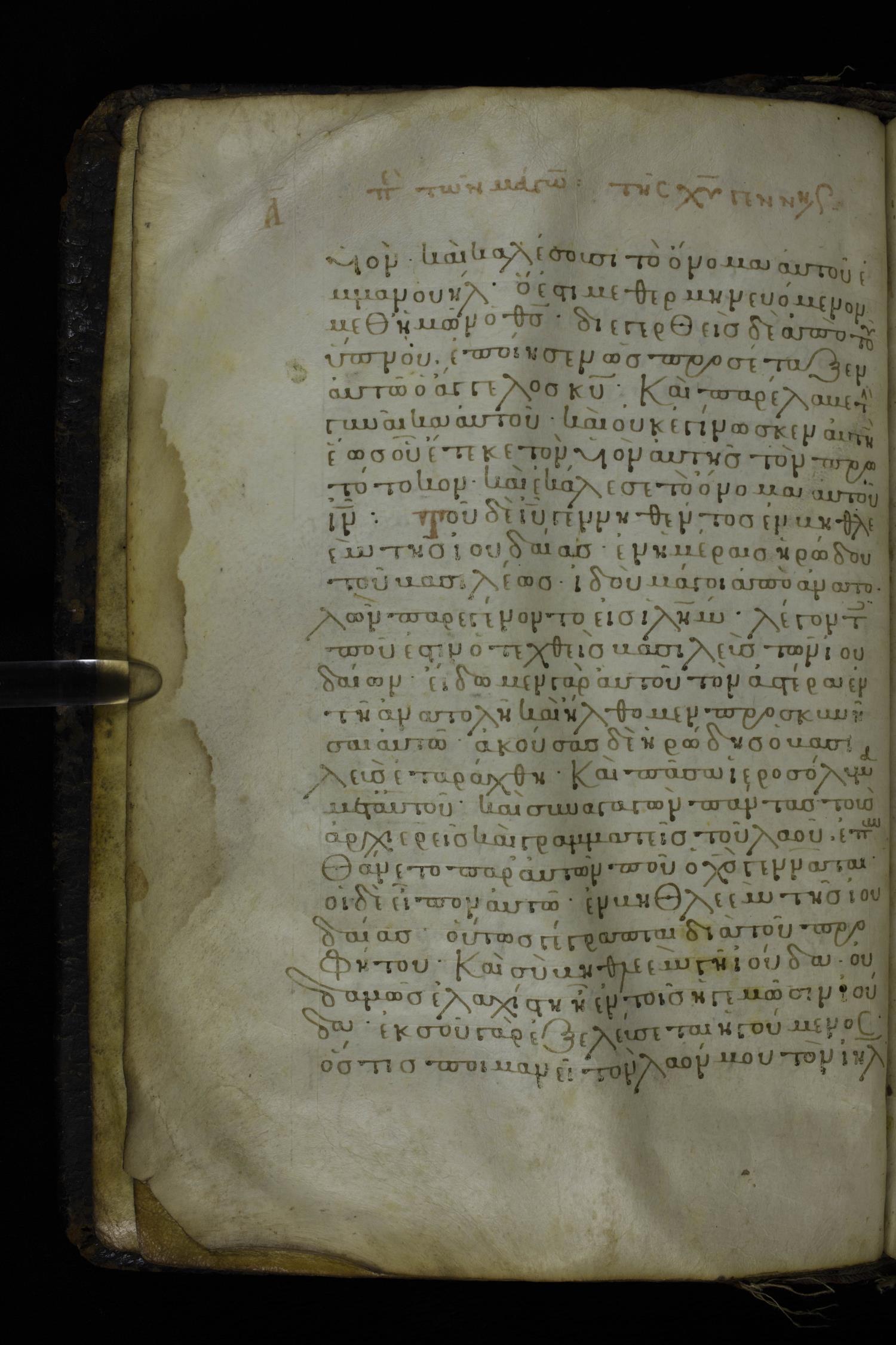 Twelfth century minuscule of the Gospels on parchment; 230 leaves, 1 column, 24-26 lines per column. Images were taken at the National Library of Greece in Athens.