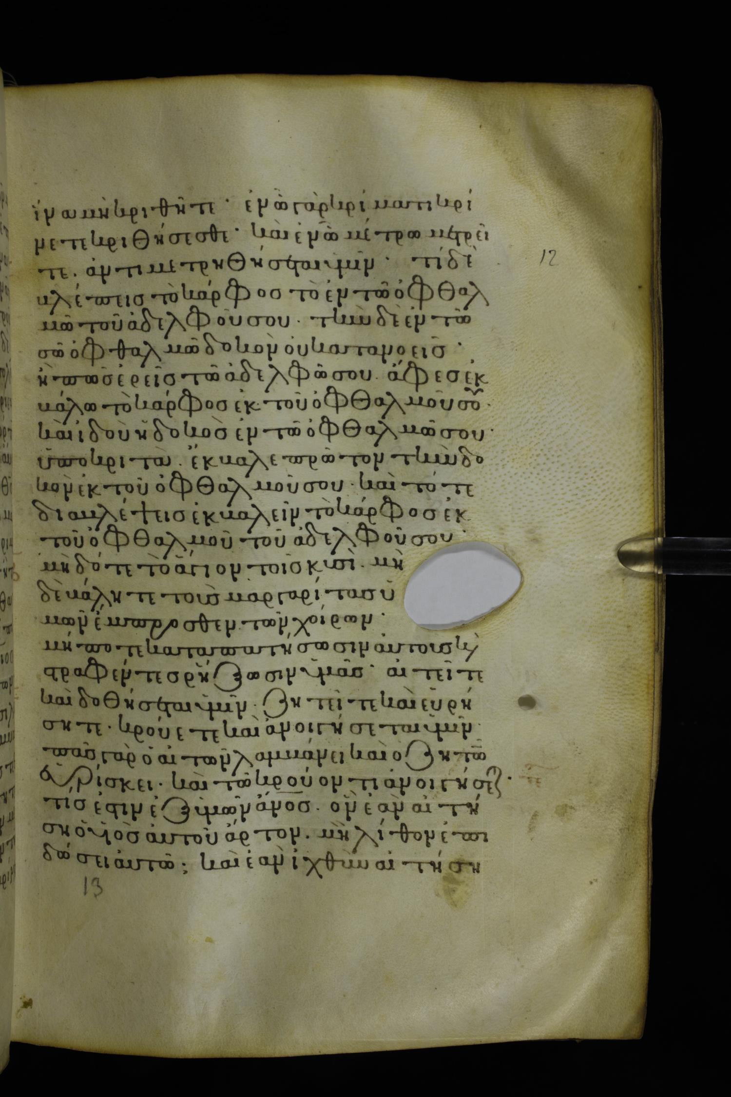 Twelfth century minuscule of the Gospels on parchment; 230 leaves, 1 column, 24-26 lines per column. Images were taken at the National Library of Greece in Athens.