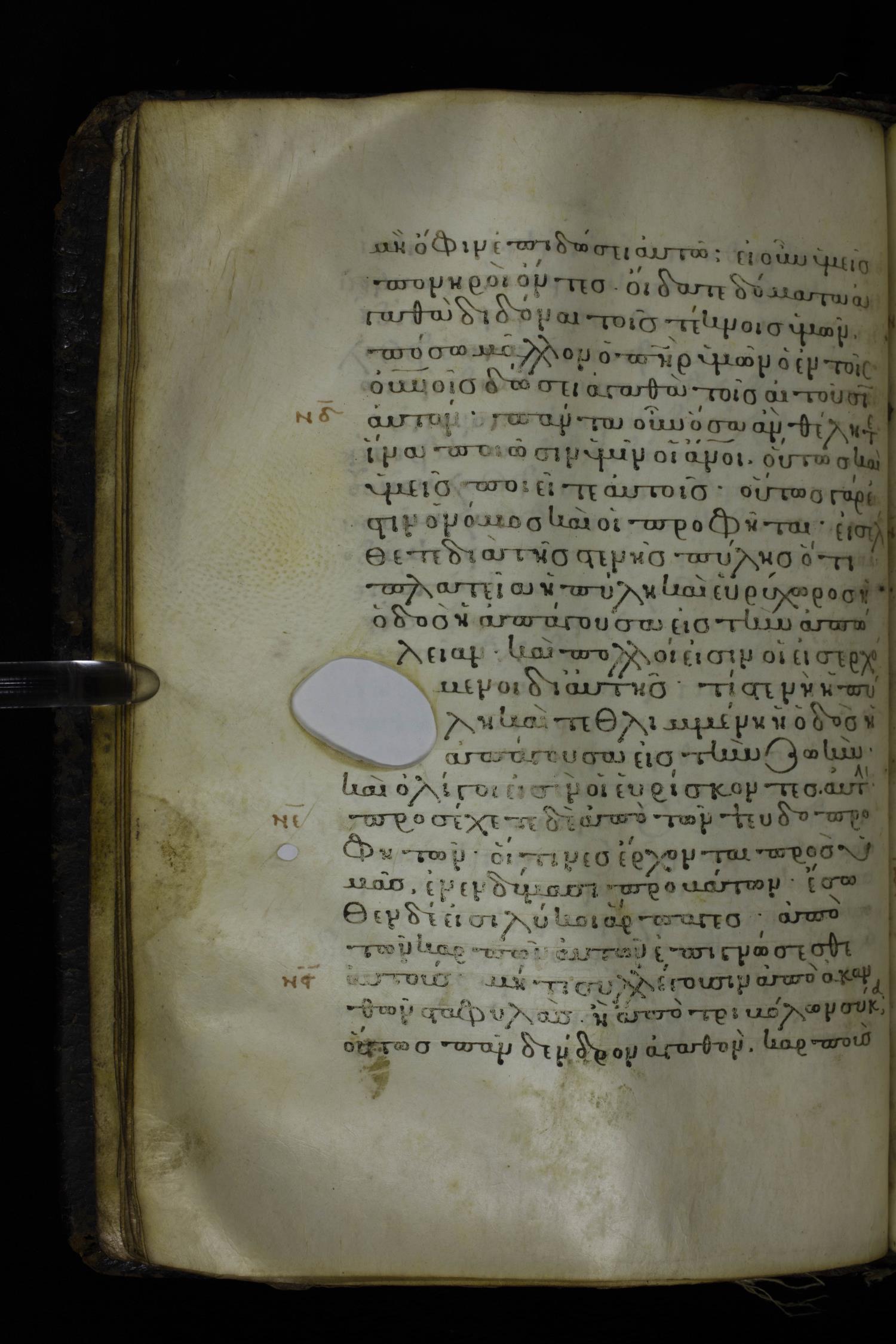 Twelfth century minuscule of the Gospels on parchment; 230 leaves, 1 column, 24-26 lines per column. Images were taken at the National Library of Greece in Athens.