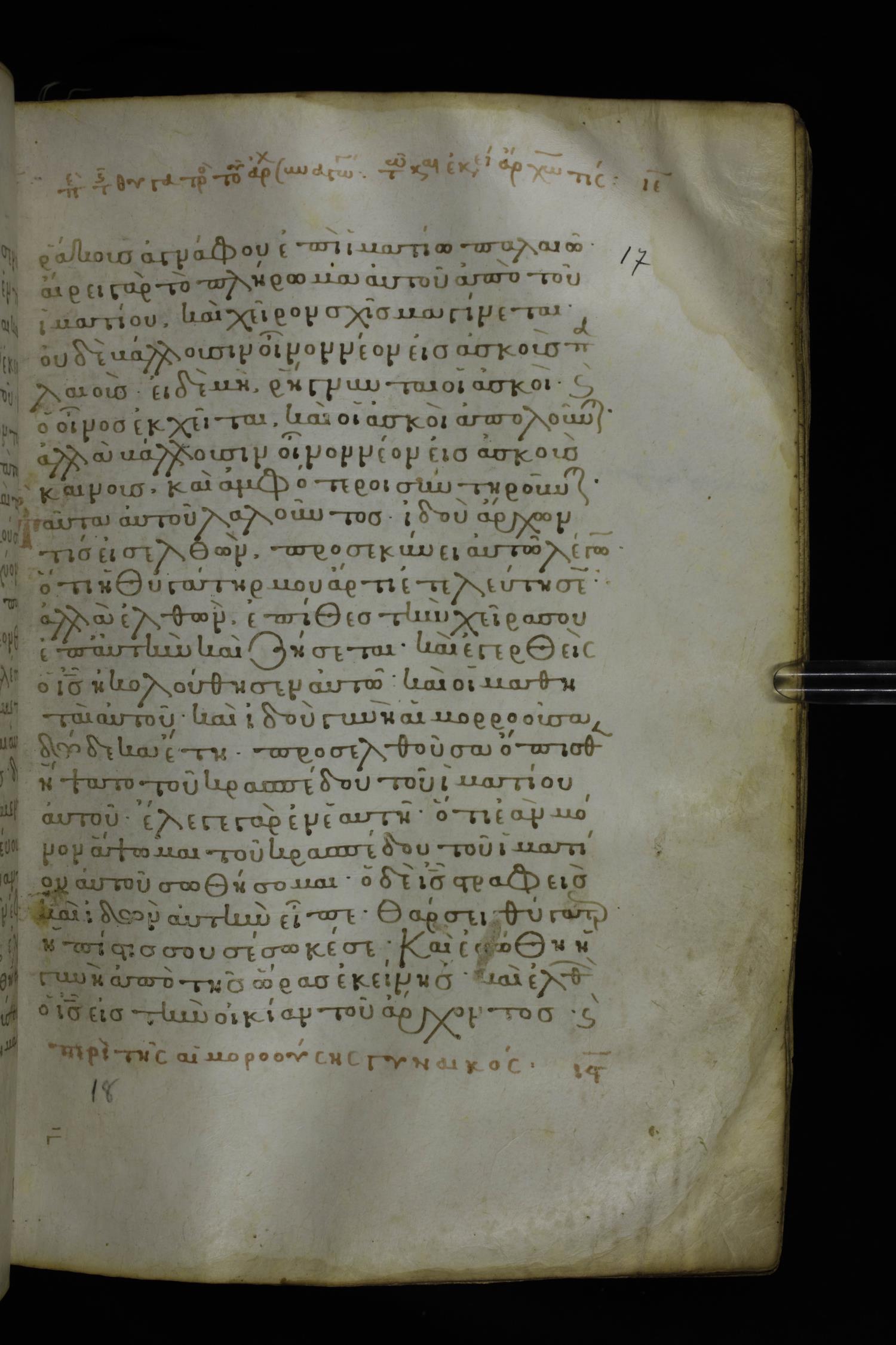 Twelfth century minuscule of the Gospels on parchment; 230 leaves, 1 column, 24-26 lines per column. Images were taken at the National Library of Greece in Athens.