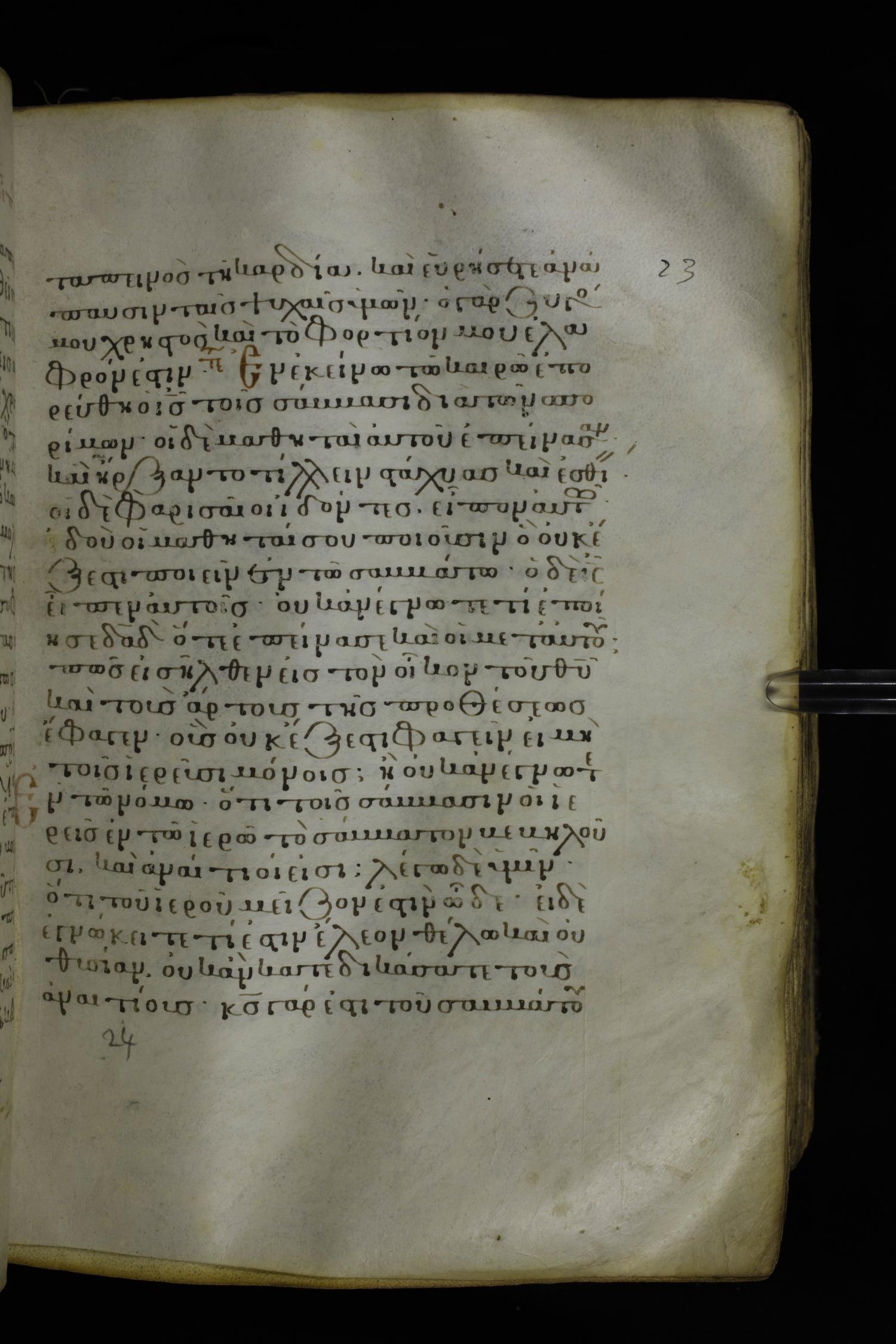 Twelfth century minuscule of the Gospels on parchment; 230 leaves, 1 column, 24-26 lines per column. Images were taken at the National Library of Greece in Athens.