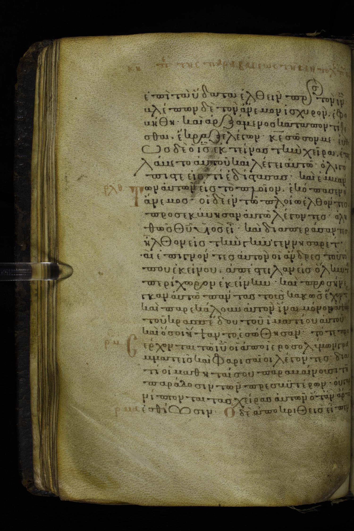 Twelfth century minuscule of the Gospels on parchment; 230 leaves, 1 column, 24-26 lines per column. Images were taken at the National Library of Greece in Athens.