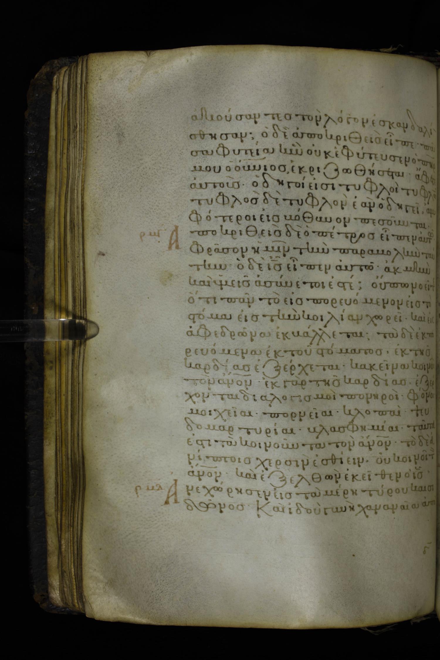Twelfth century minuscule of the Gospels on parchment; 230 leaves, 1 column, 24-26 lines per column. Images were taken at the National Library of Greece in Athens.
