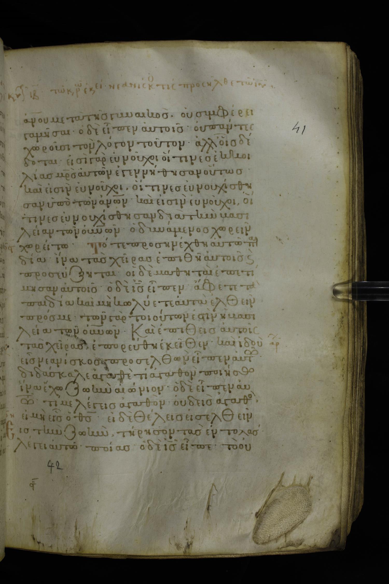 Twelfth century minuscule of the Gospels on parchment; 230 leaves, 1 column, 24-26 lines per column. Images were taken at the National Library of Greece in Athens.