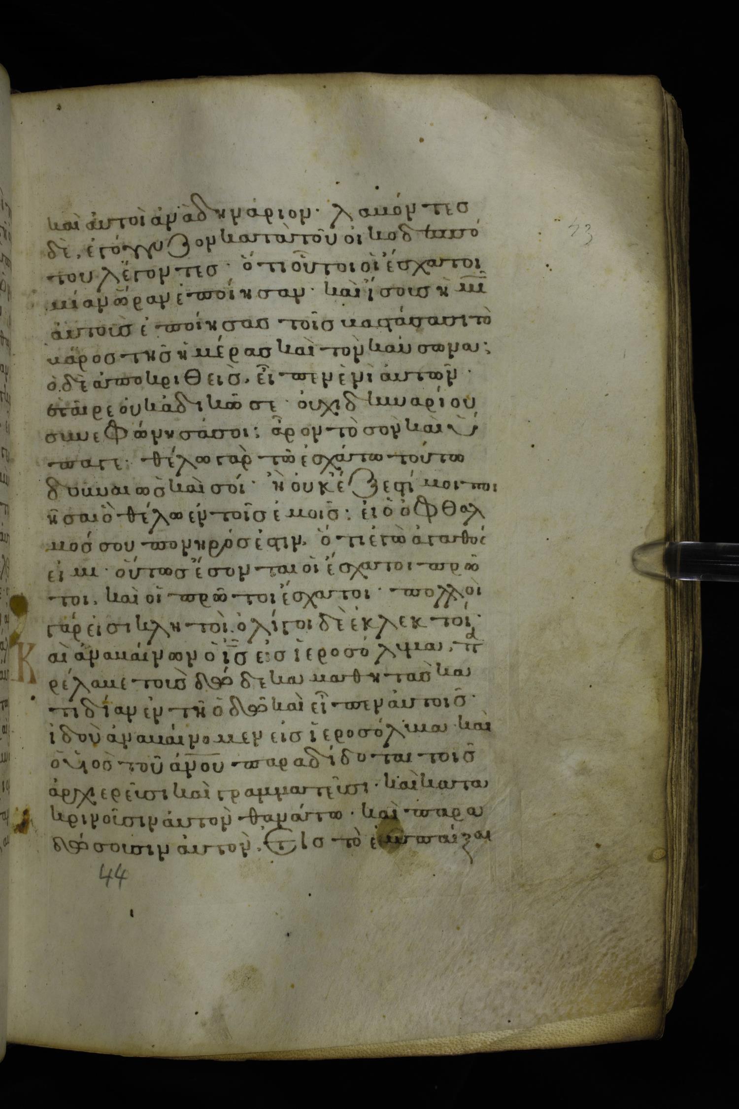 Twelfth century minuscule of the Gospels on parchment; 230 leaves, 1 column, 24-26 lines per column. Images were taken at the National Library of Greece in Athens.