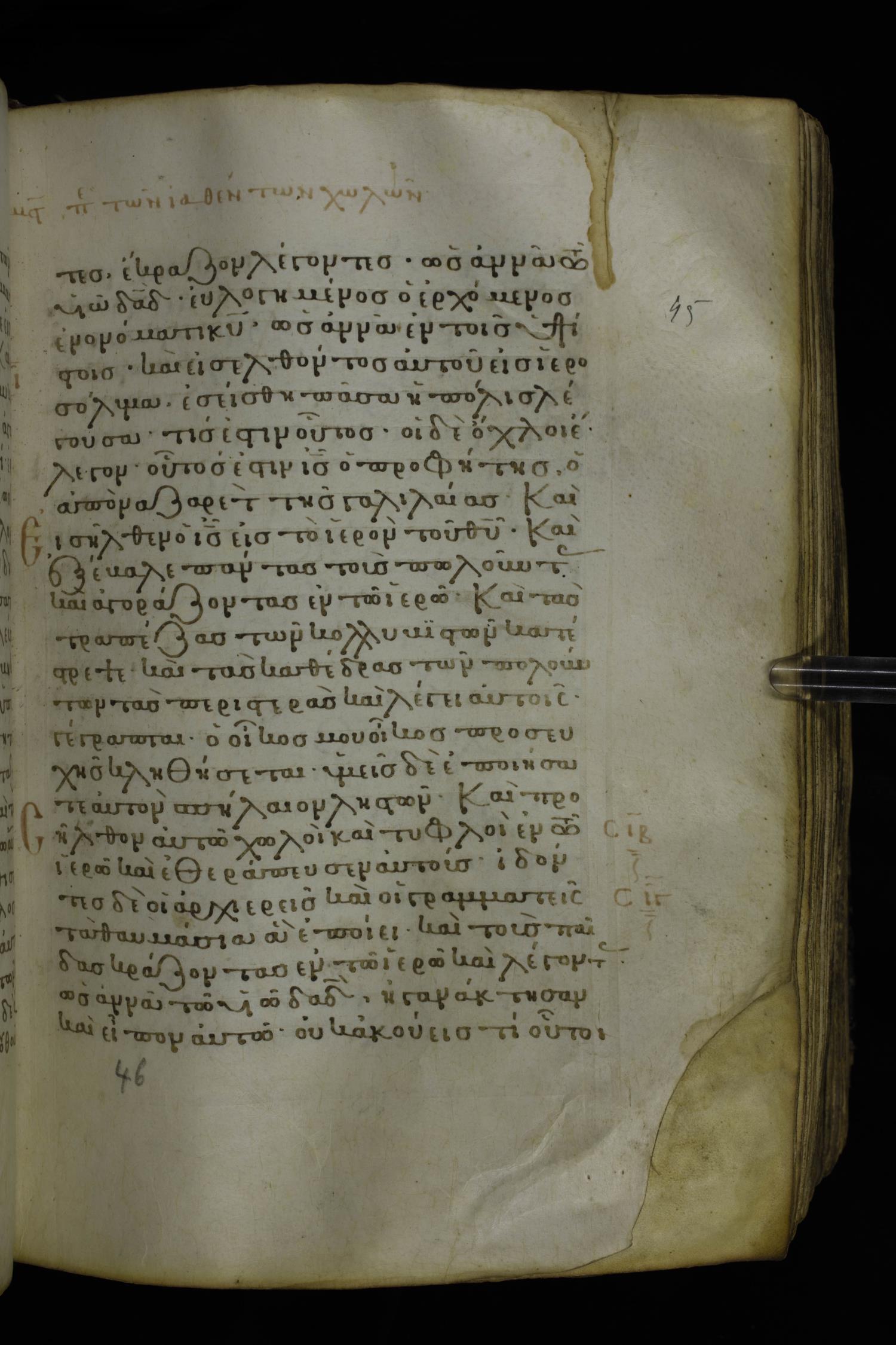 Twelfth century minuscule of the Gospels on parchment; 230 leaves, 1 column, 24-26 lines per column. Images were taken at the National Library of Greece in Athens.