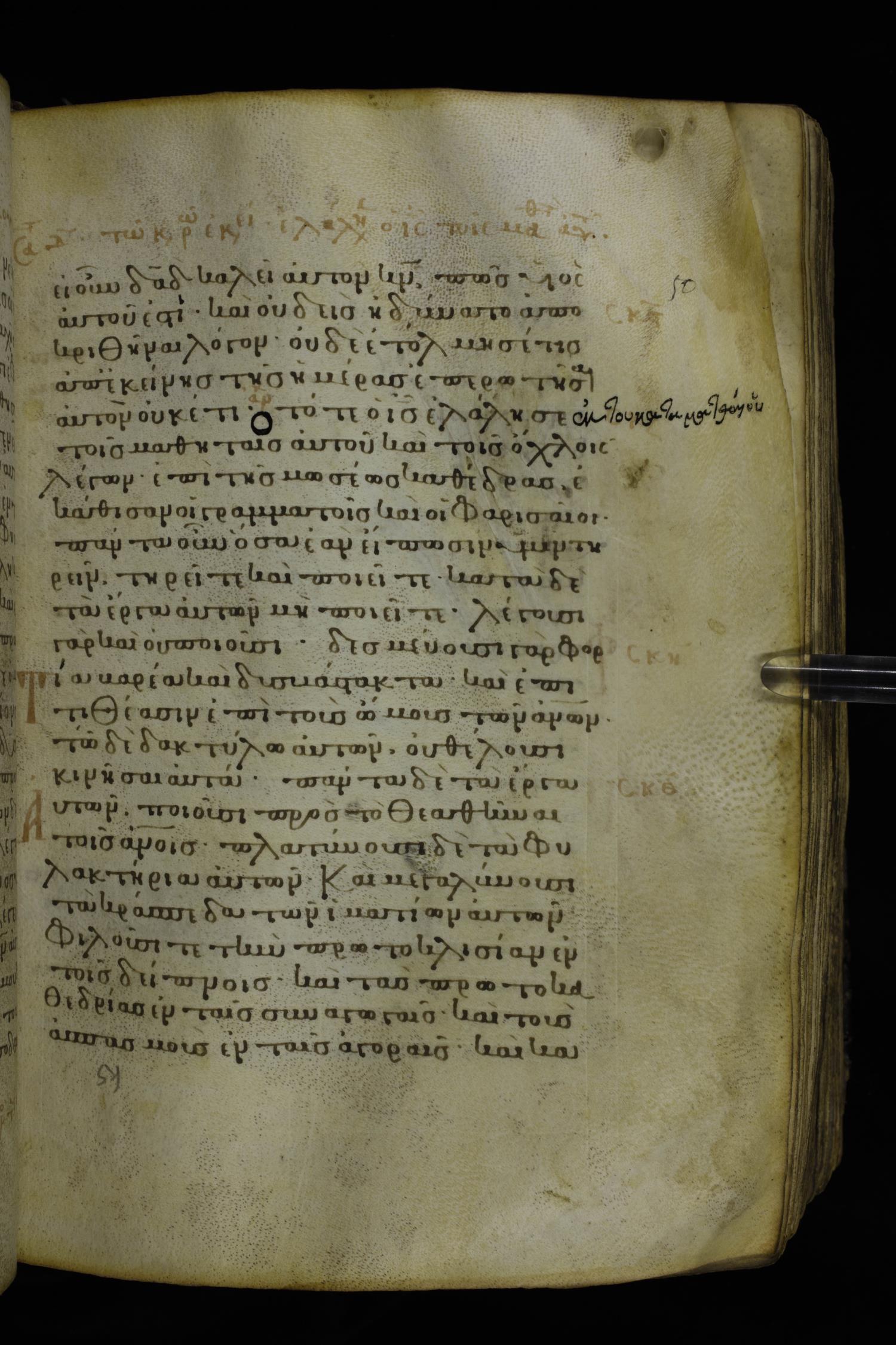 Twelfth century minuscule of the Gospels on parchment; 230 leaves, 1 column, 24-26 lines per column. Images were taken at the National Library of Greece in Athens.