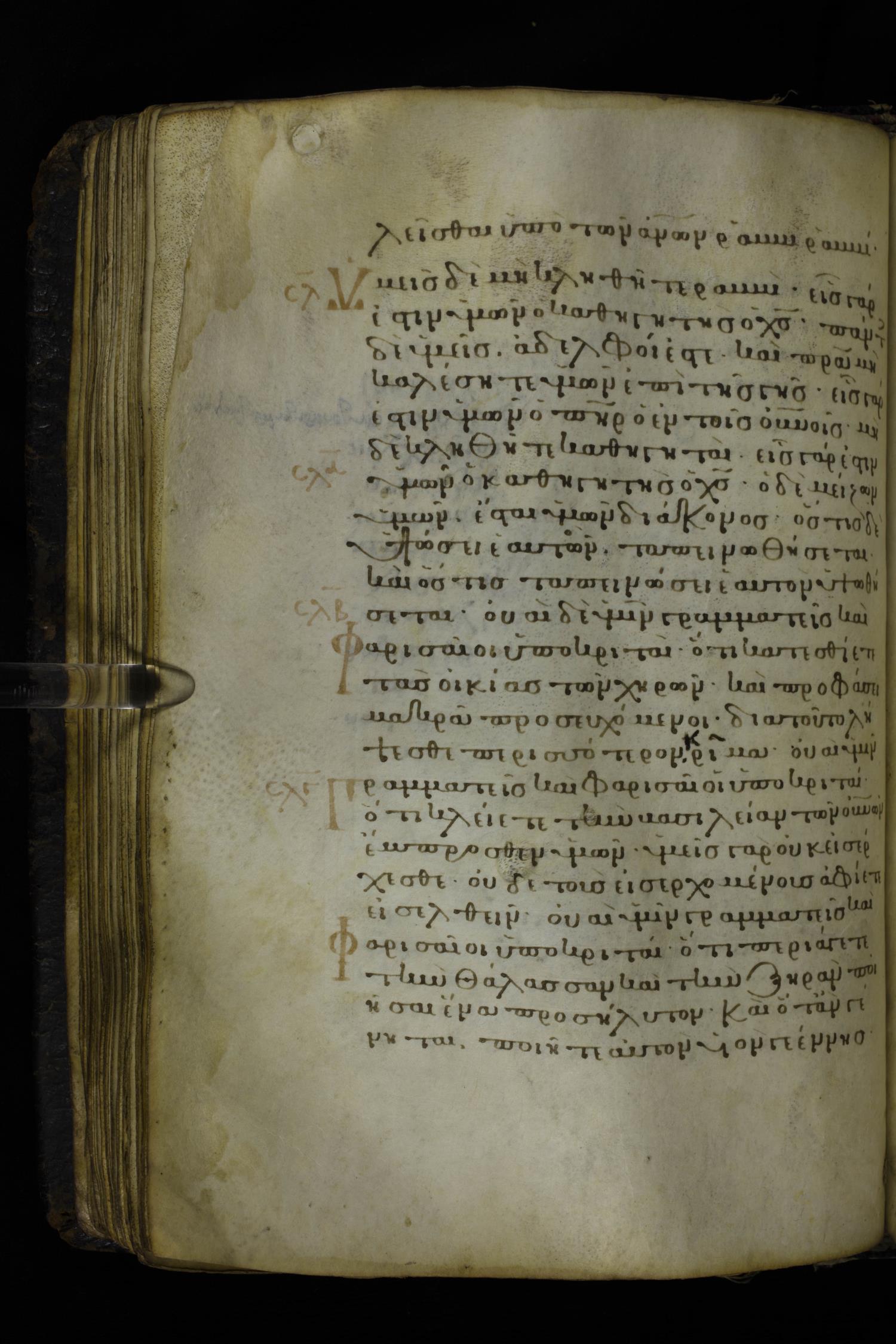 Twelfth century minuscule of the Gospels on parchment; 230 leaves, 1 column, 24-26 lines per column. Images were taken at the National Library of Greece in Athens.