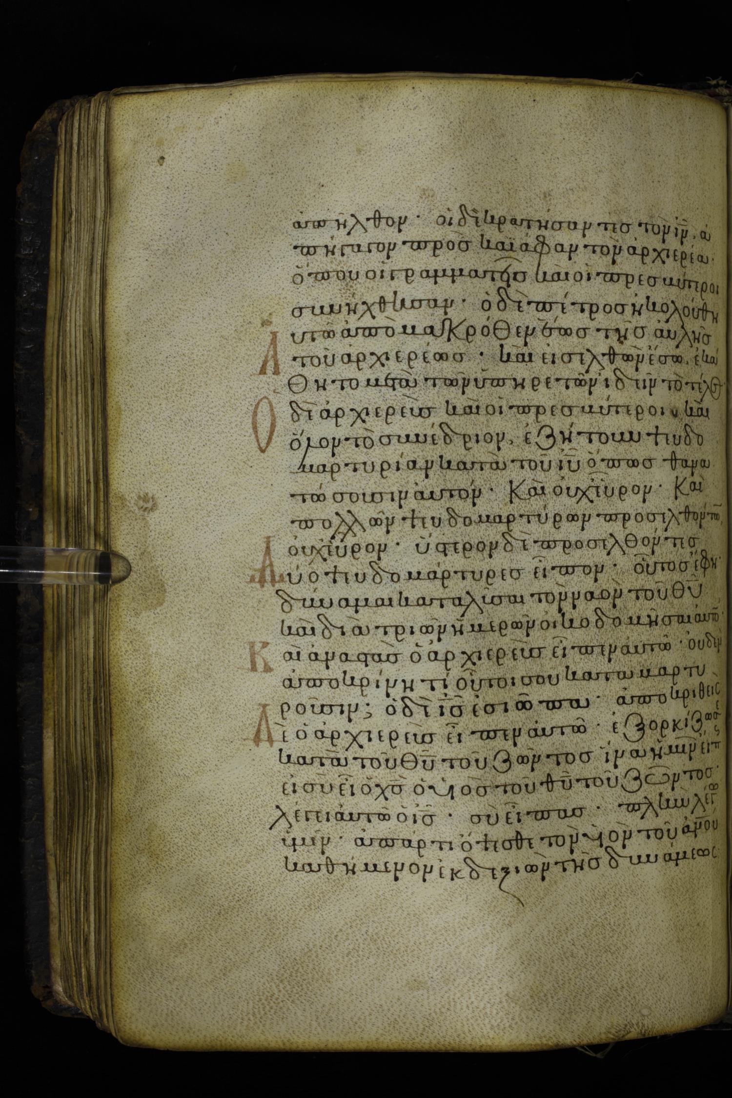 Twelfth century minuscule of the Gospels on parchment; 230 leaves, 1 column, 24-26 lines per column. Images were taken at the National Library of Greece in Athens.